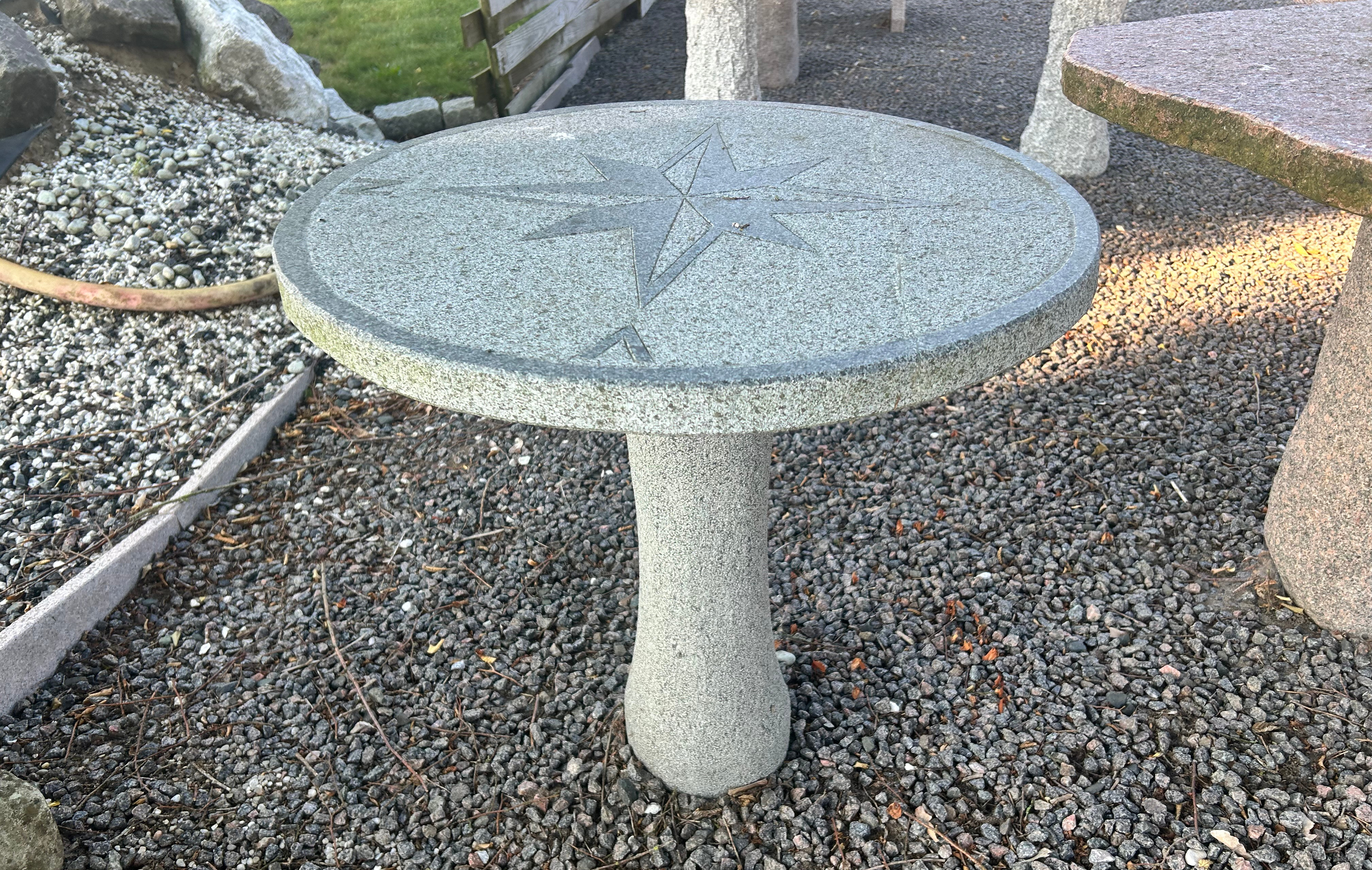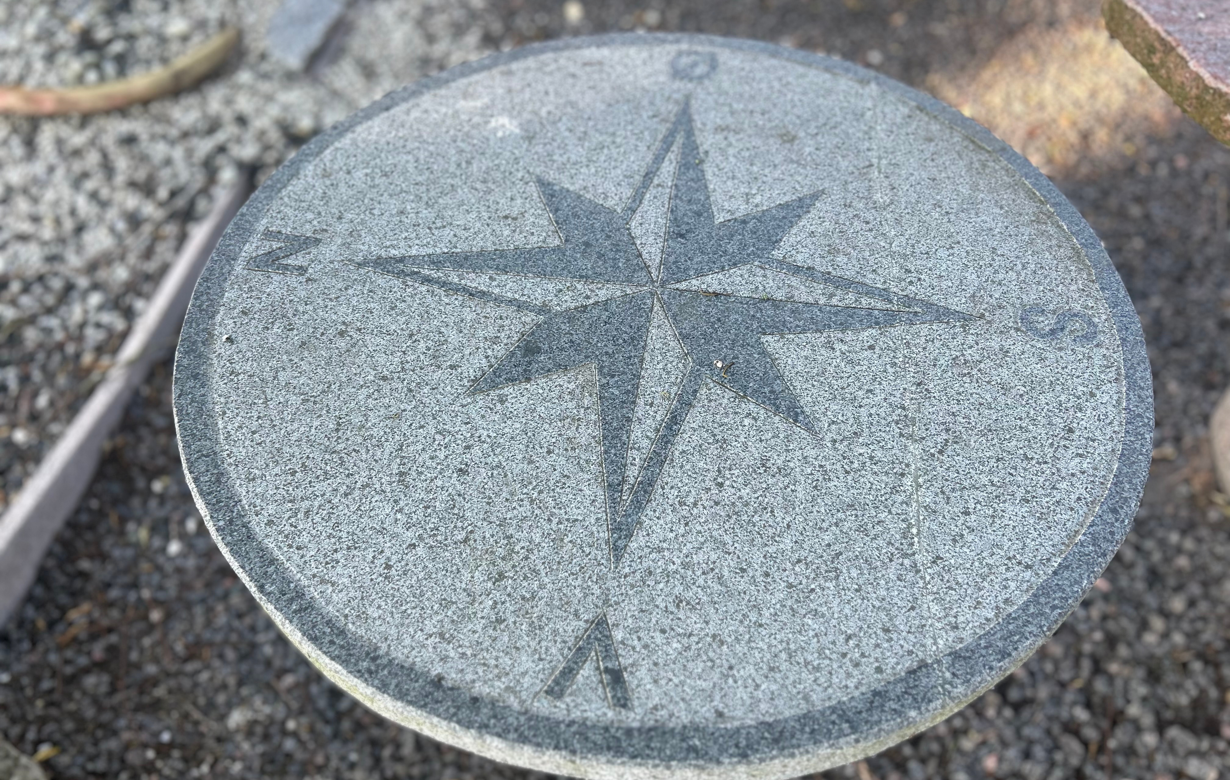 Bord med kompasmotiv i gråsort granit med polerede detaljer i kompasrosen.
