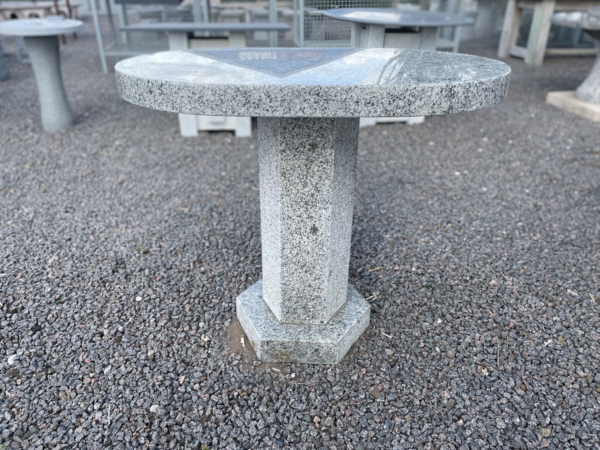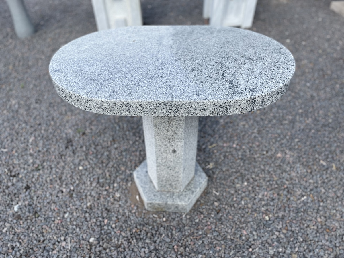 Lysegrå ovalt granitbord, med en kantet sokkel og bordben. Bordet er fuldpoleret og bringer granittens farvespil frem, og det ses tydeligt hvordan granitten variere. Bordet kan stilles i et hyggeligt hjørne i haven eller ved hus og terrasse.
