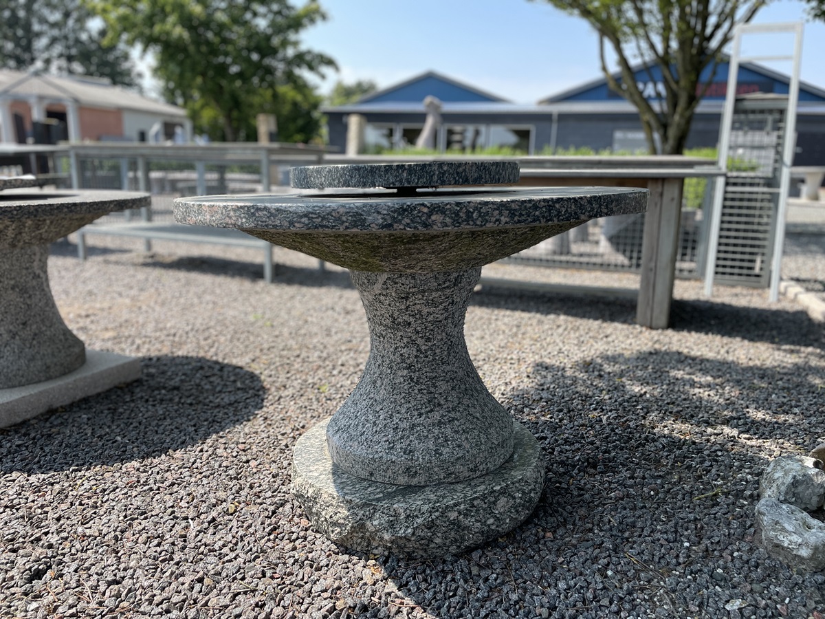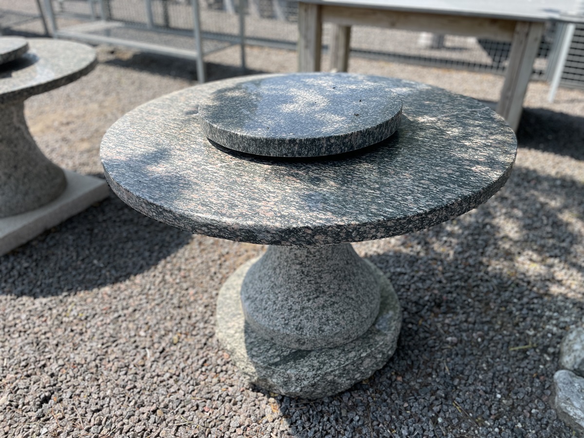 Flot granitbord med poleret overflade og to bordplader. Den øverste plade kan rotere rundt, og kan derfor gøre serveringen nemmere for hele bordet. Bordet vil passe godt ind på terrassen eller et sted i haven, hvor det er oplagt til måltider eller kaffe.
