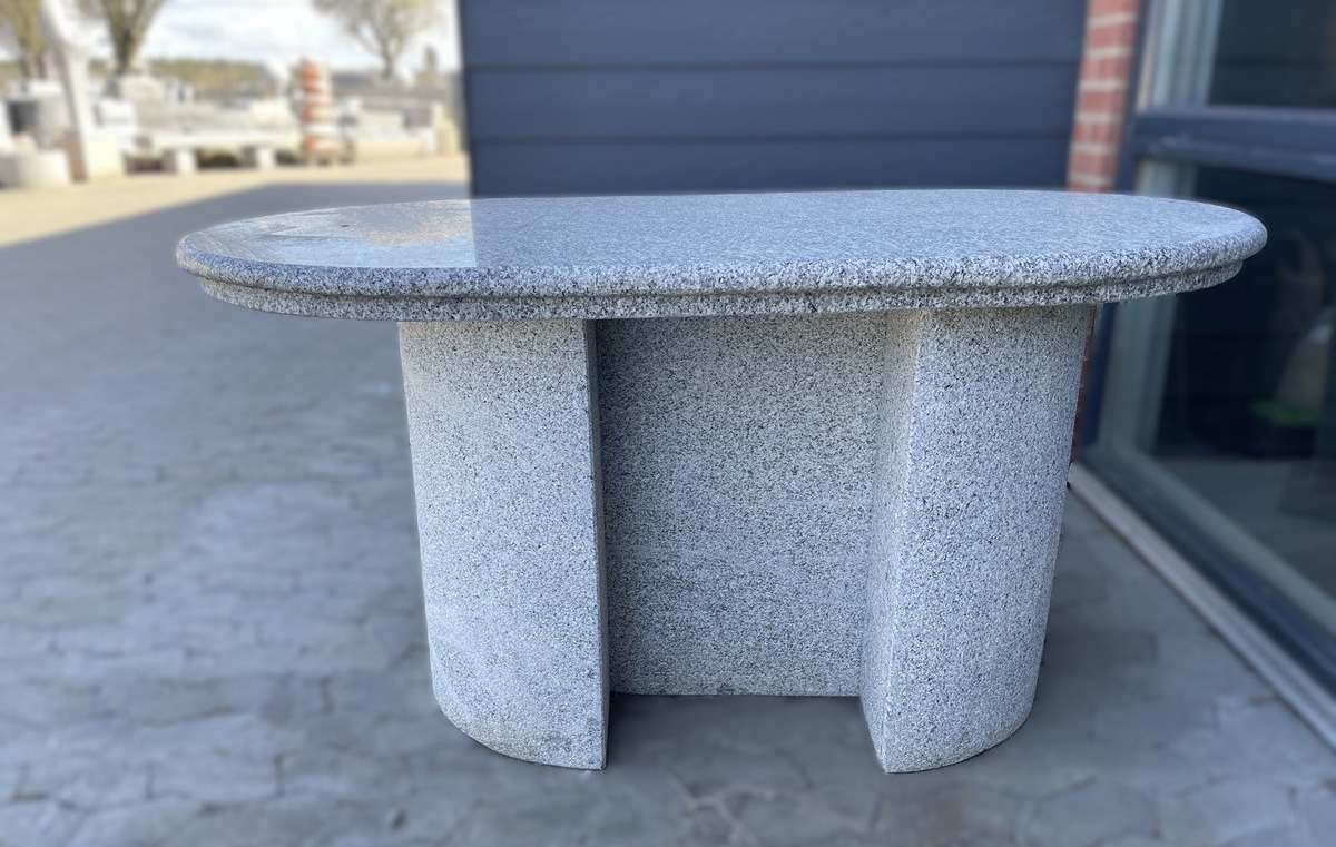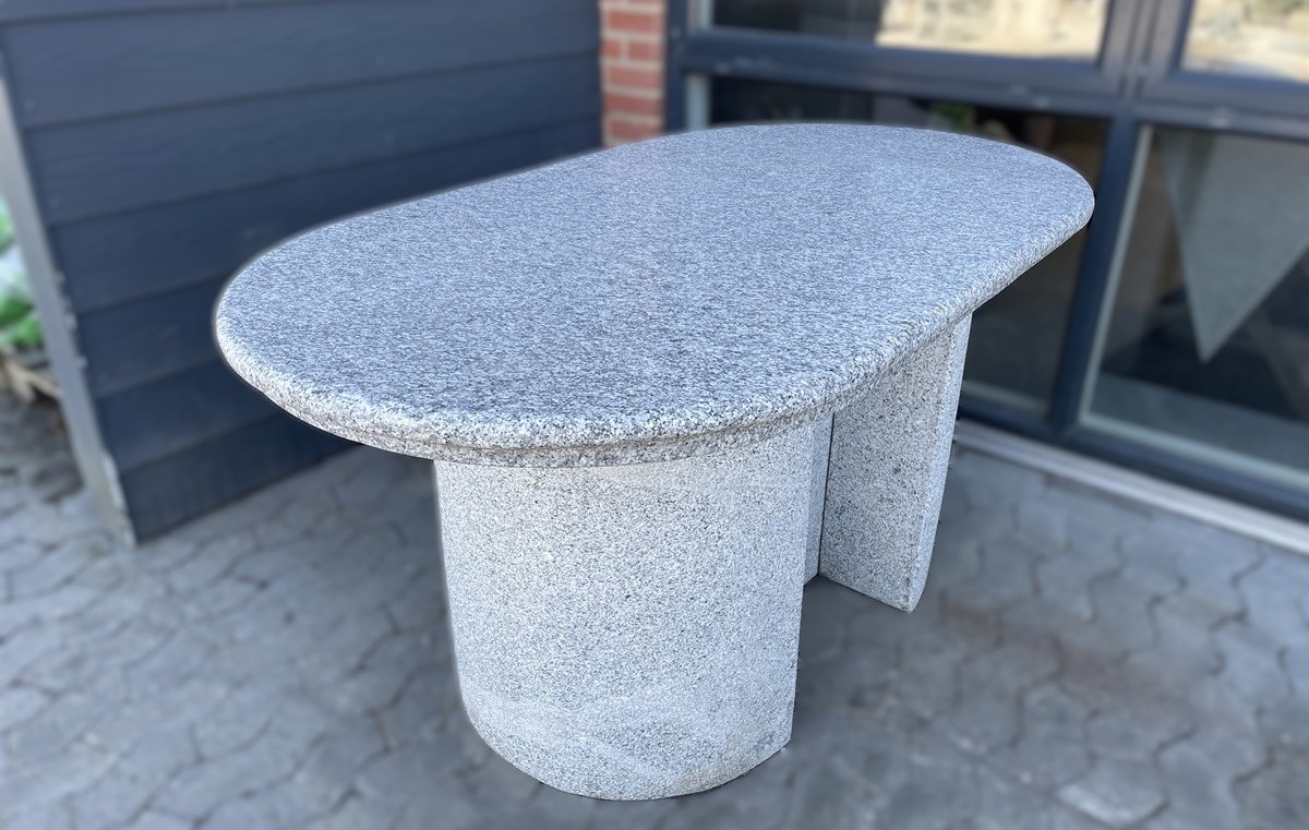 Massivt havebord lavet i lysegrå granit. Bordpladen har en poleret overflade der frembringer granittens varierende farvespil, hvor stellet/bordben er stokhugget og har en ru overflade. Bordet kan være samlingspunkt i haven eller på terrassen for familie og venner. Bordet kommer i 4 dele, som gør monteringen lettere.
