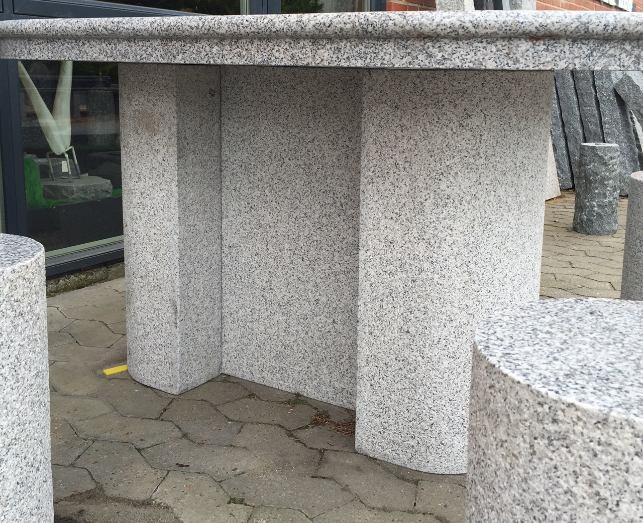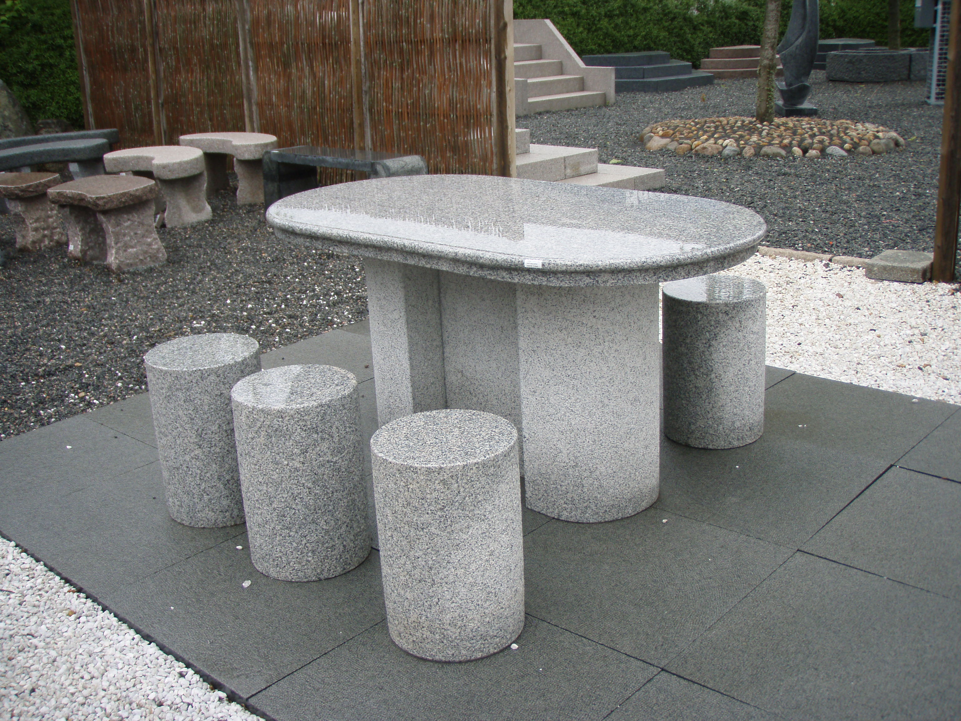 Flot og stilfuldt havemøbelsæt - model Skibet. Produceret i lys grå granit. Bordplade og taburetter er polerede på toppen, som derved gør det lette at tørre over. Siderne har rå/rustikke overflader. Havemøbler i natursten kræver stort set ingen former for vedligeholdelse, bortset fra almindelig rengøring. Hvis der er kommet grønne alger på, så kan du sagtens tage højtryksrenseren og give møblet en tur. Efter en omgang med højtryksrenseren vil møbelsættet igen fremstå som nyt. Dette møbelsæt skal heller ikke indenfor om vinteren, da det ikke påvirkes af årstidernes skiften. Så slip for at flytte havemøblerne ud og ind hvert år. Natursten bliver kun smukkere med årerne.