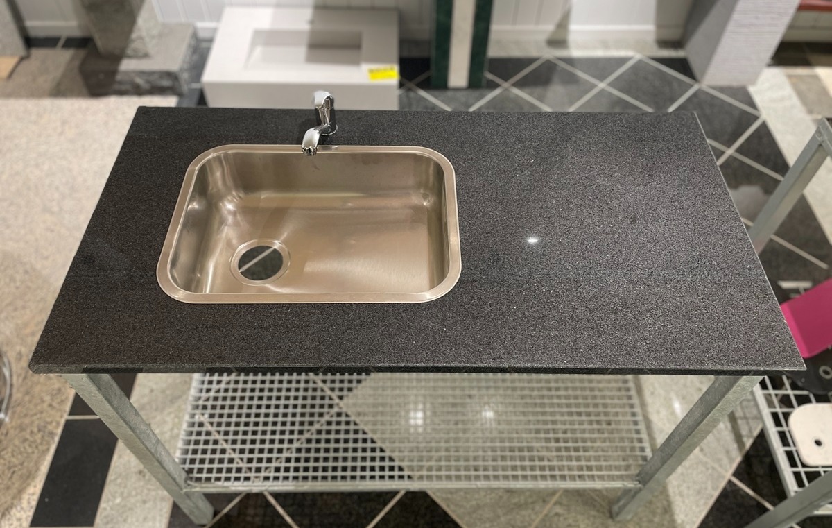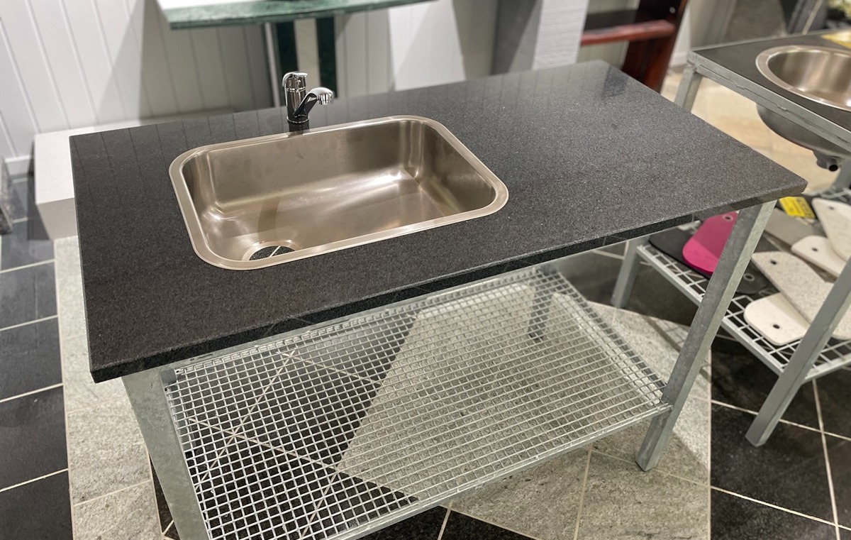 Udekøkken med stel i galvaniseret stål med gråsort eller lys grå poleret granitbordplade samt mulighed for montering af armatur og topmonteret stålvask.
