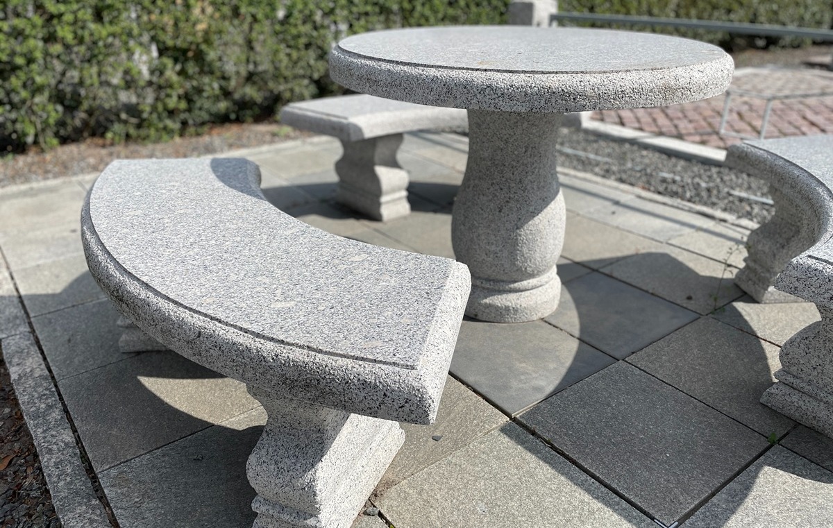 Havemøbelsæt i grå granit med bløde detaljerede kanter. Sættet består af et bord og 3 bænke. Slip for havemøbler der skal sættes ind om vinteren med granit havemøbler i granit. Kan tåle al slags vind og vejr.