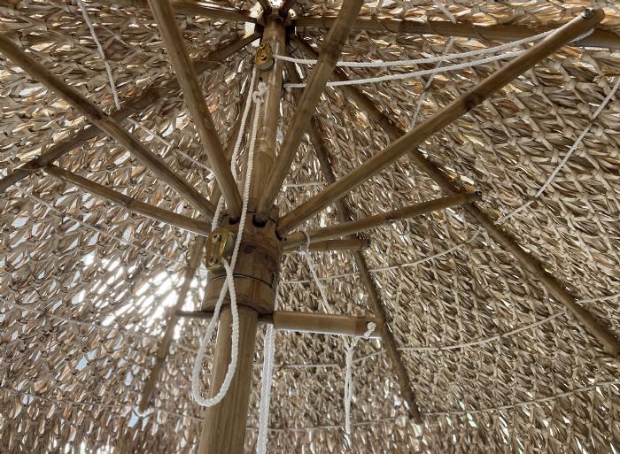 Parasol lavet i bambus og med skærm af palmeblade.