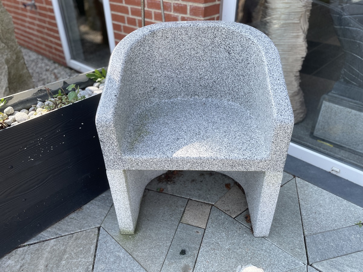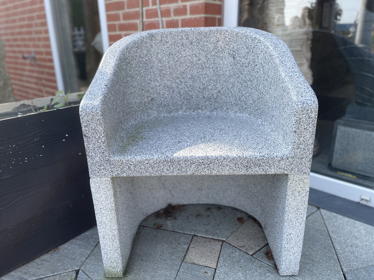 Granitstol i lysegrå granit. Stolen er designet med afrundet ryglæn og poleret sæde, for ekstra komfort, resten af stolen er stokhugget og står i god kontrast til det polerede.