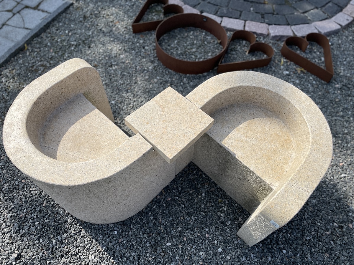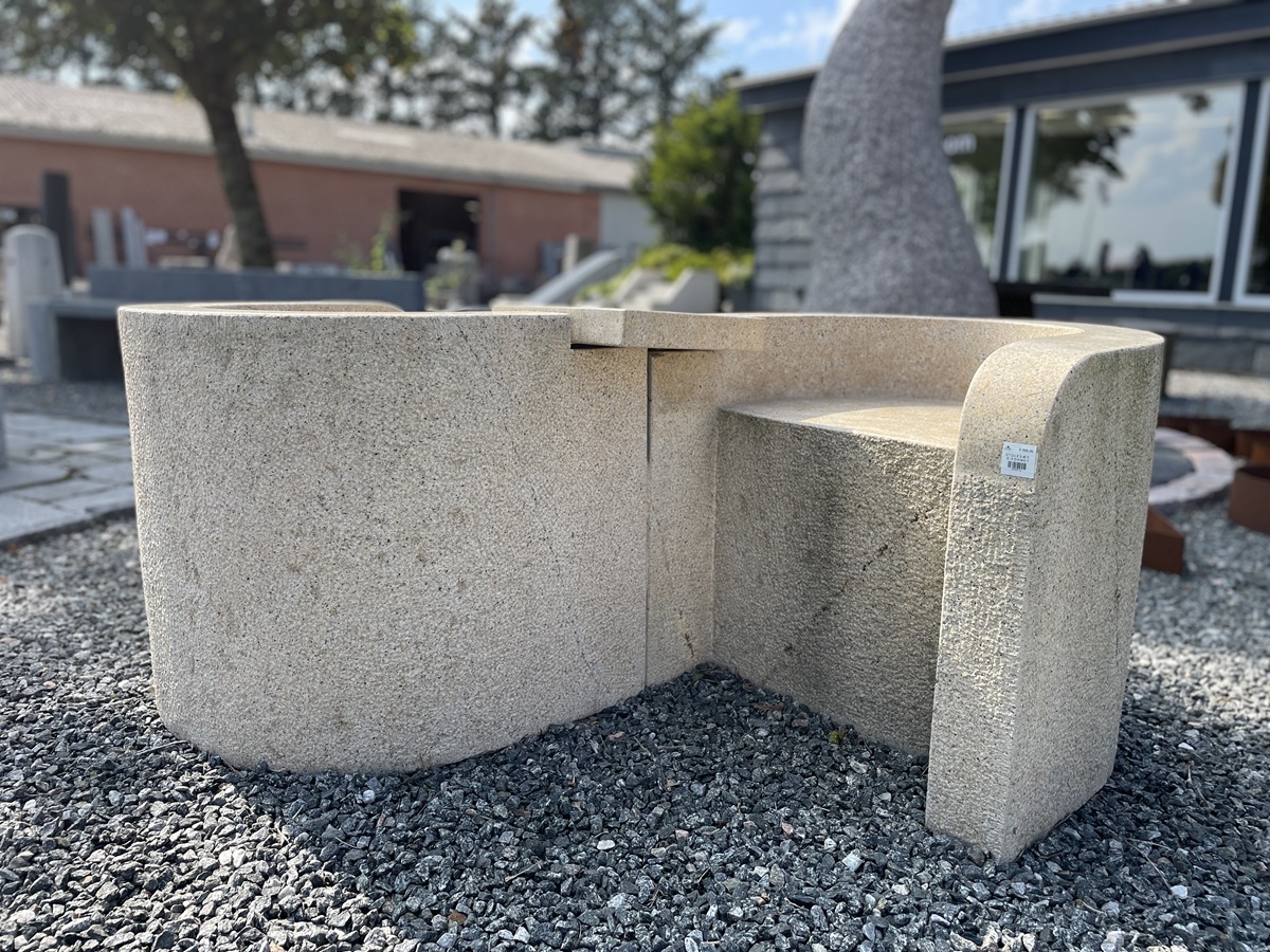 Granit stolesæt formet som et S med aftageligt bord i midten. Stolesættet indbyder til en kop kaffe, og samtale da man kommer til at sidde overfor hinanden. Stolen er lavet i fuldpoleret gul granit, den polerede overflade bringer granittens flotte farvespil frem. Et møbel der egner sig til den hyggelige krog i haven, eller i hjørnet på terrassen.