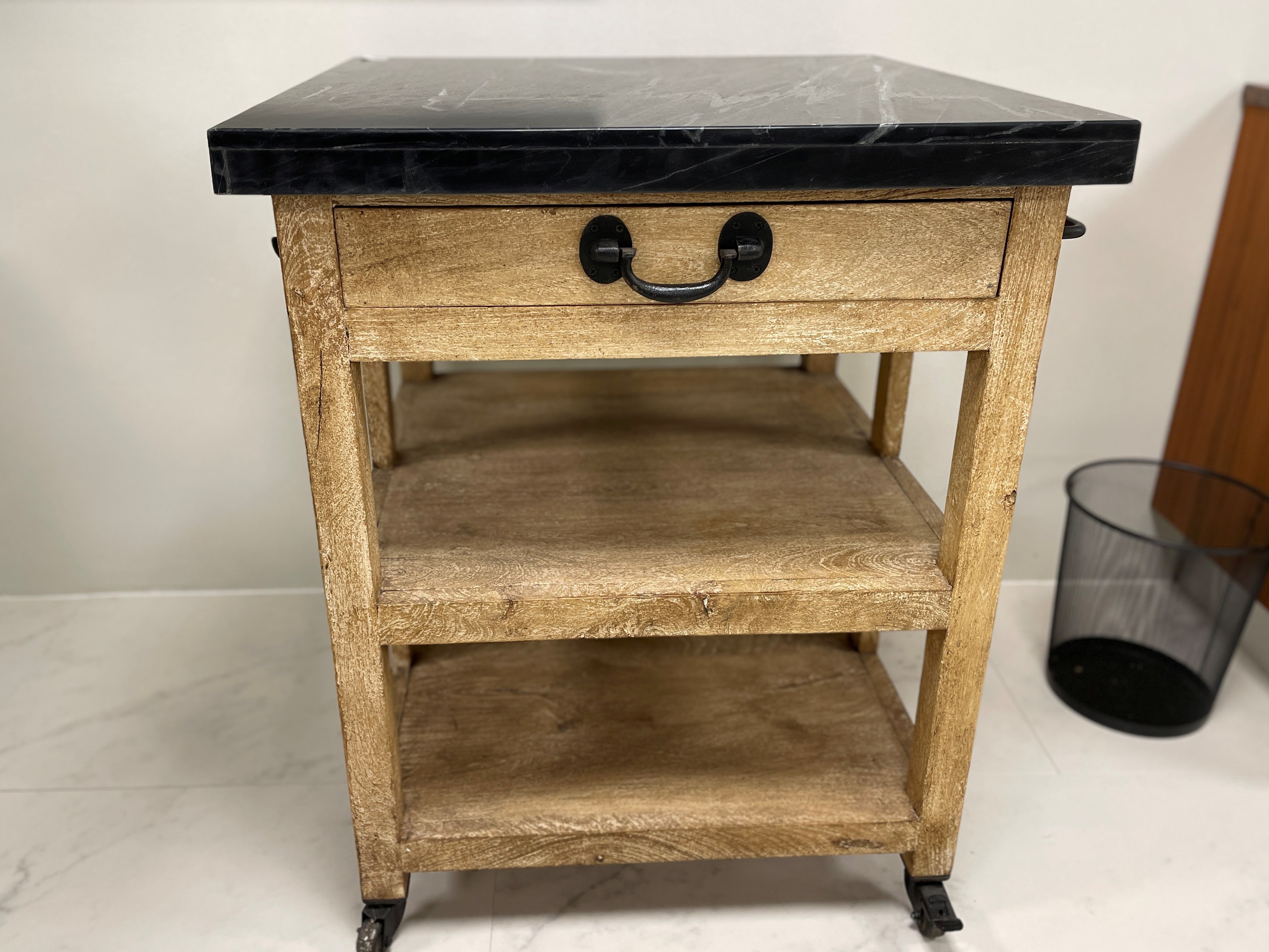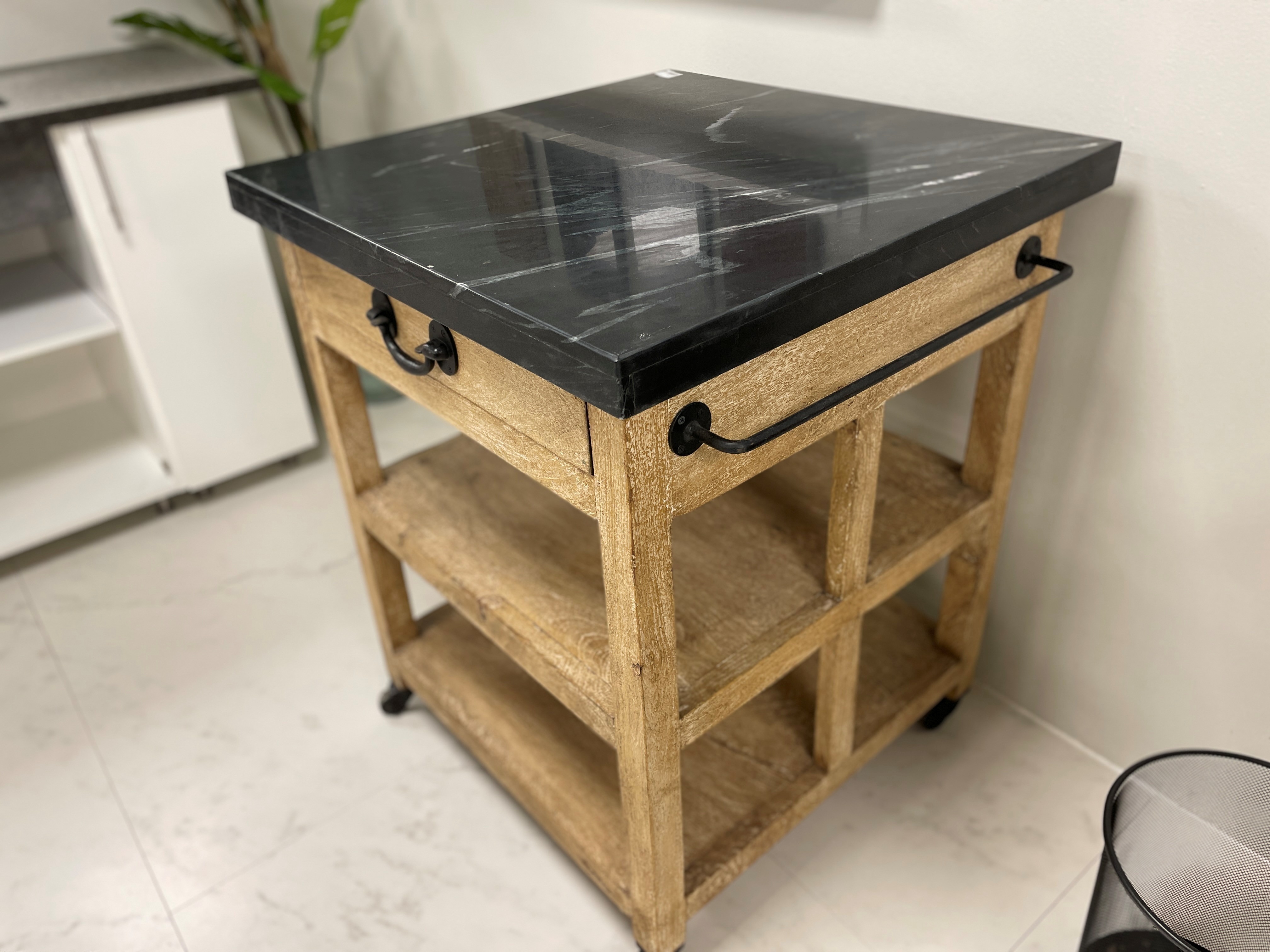 Butlerbord med sort matslebet marmorplade. Det lille bord kan nemt rulles frem og tilbage alt efter placering. Det er det perfekte ekstra køkkenbord hvis det kniber med pladsen. Butlerbordet er udført i træ med skuffe og plads til at hænge eksempelvis viskestykker.
