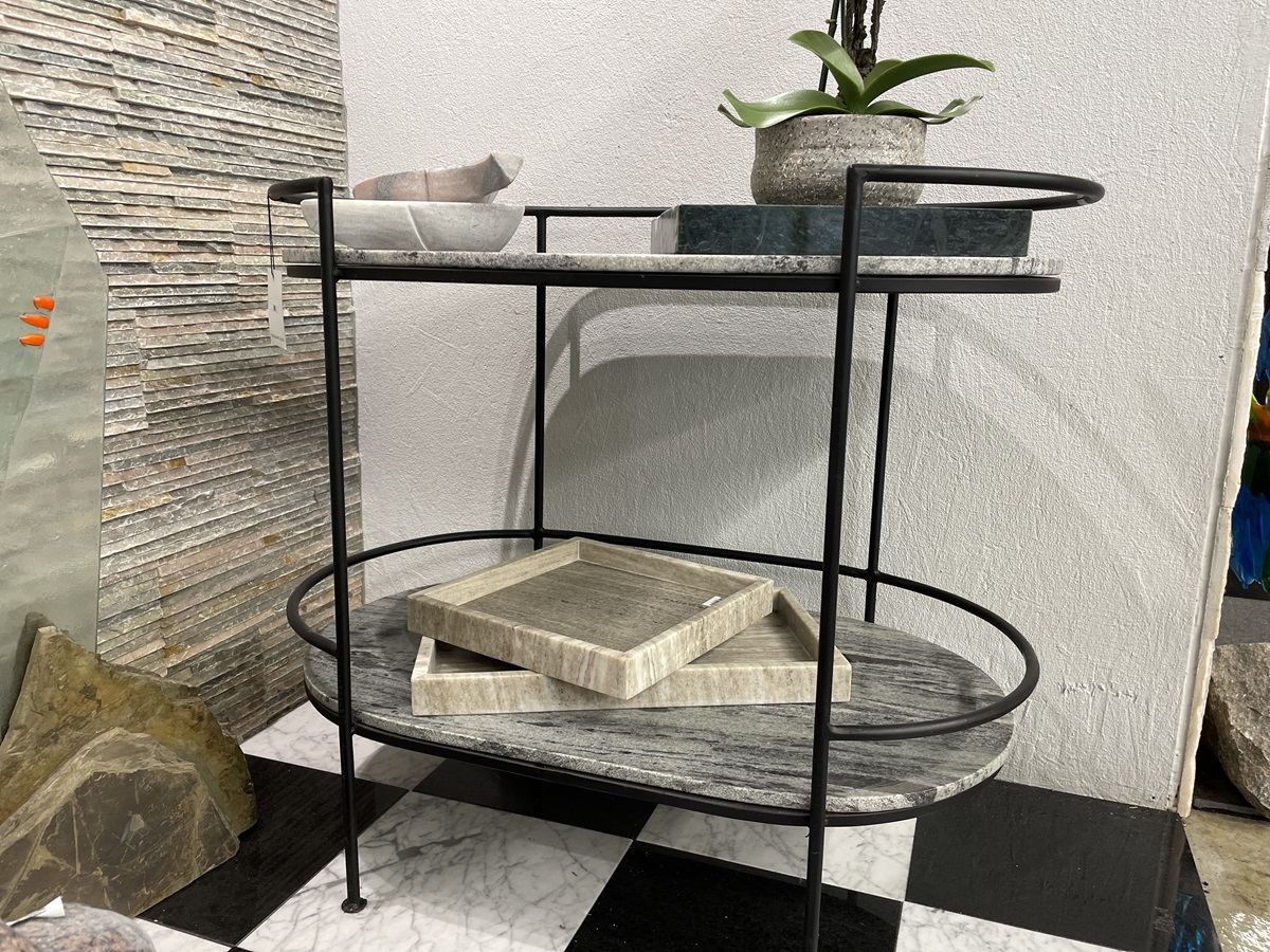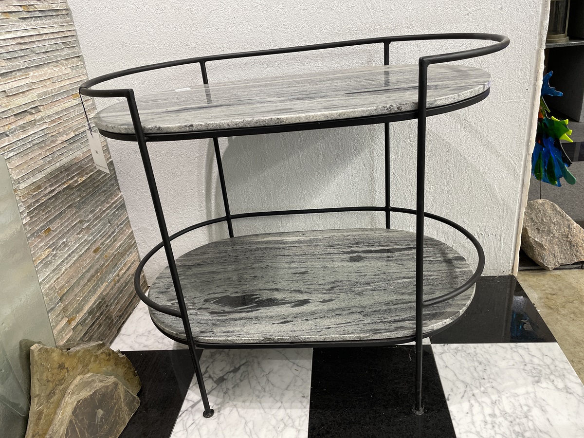 Bordet har et flot afrundet design, og det sorte stel bryder i en fin kontrast med det grå marmor. Stil bordet ved indgang, i stuen eller på terrassen og nyd at der er to flotte plader til opbevaring.