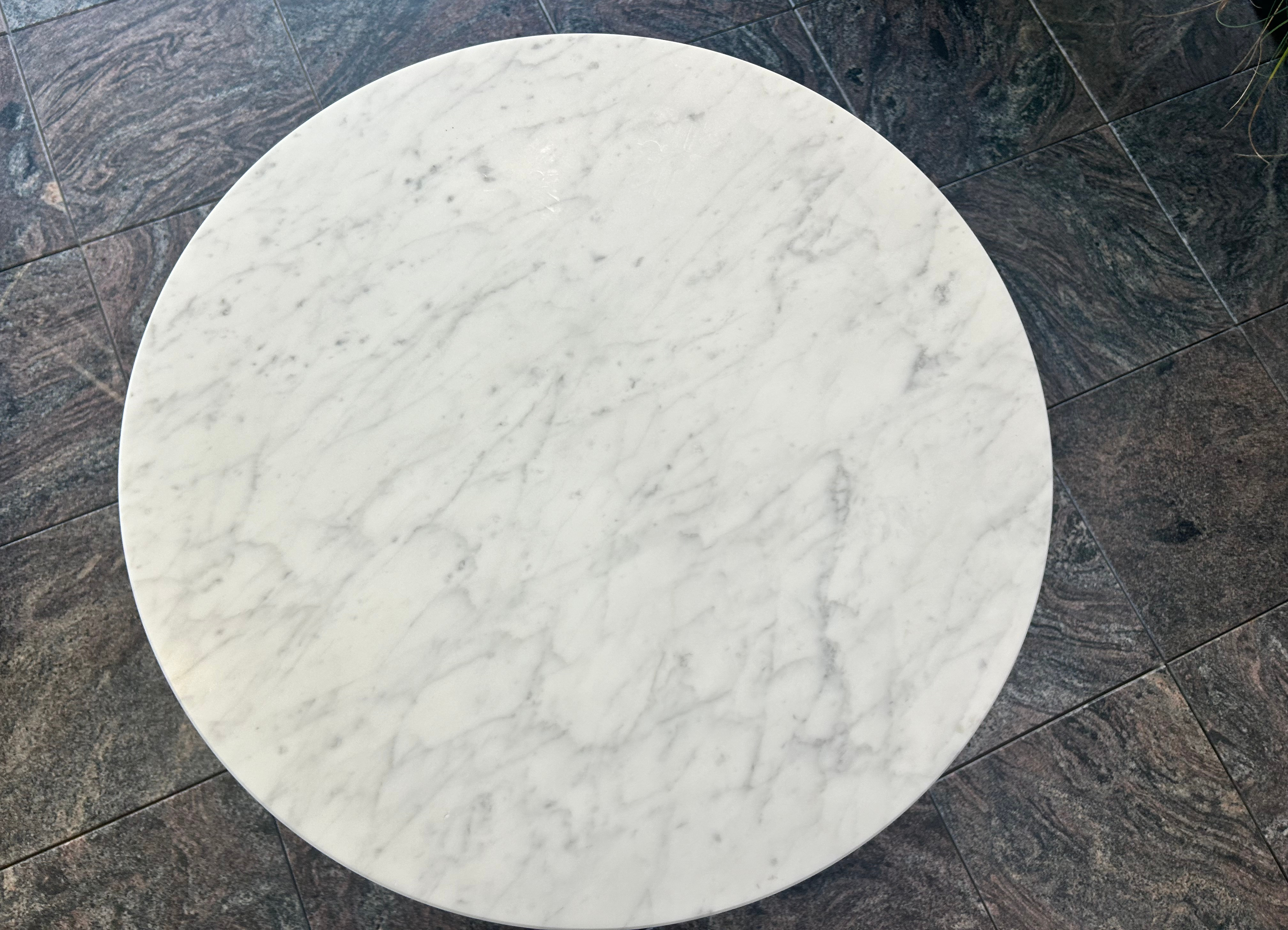 Sofabord med Bianco Carrara marmor plade på sort stel. Dette elegante sofabord kombinerer klassisk marmor med et moderne udtryk. Bordpladen er udført i ægte hvid marmor med naturlige årer, der giver hvert bord et unikt udseende. Den runde plade hviler på et sortlakeret metalstel, som giver et let og stilrent udtryk.