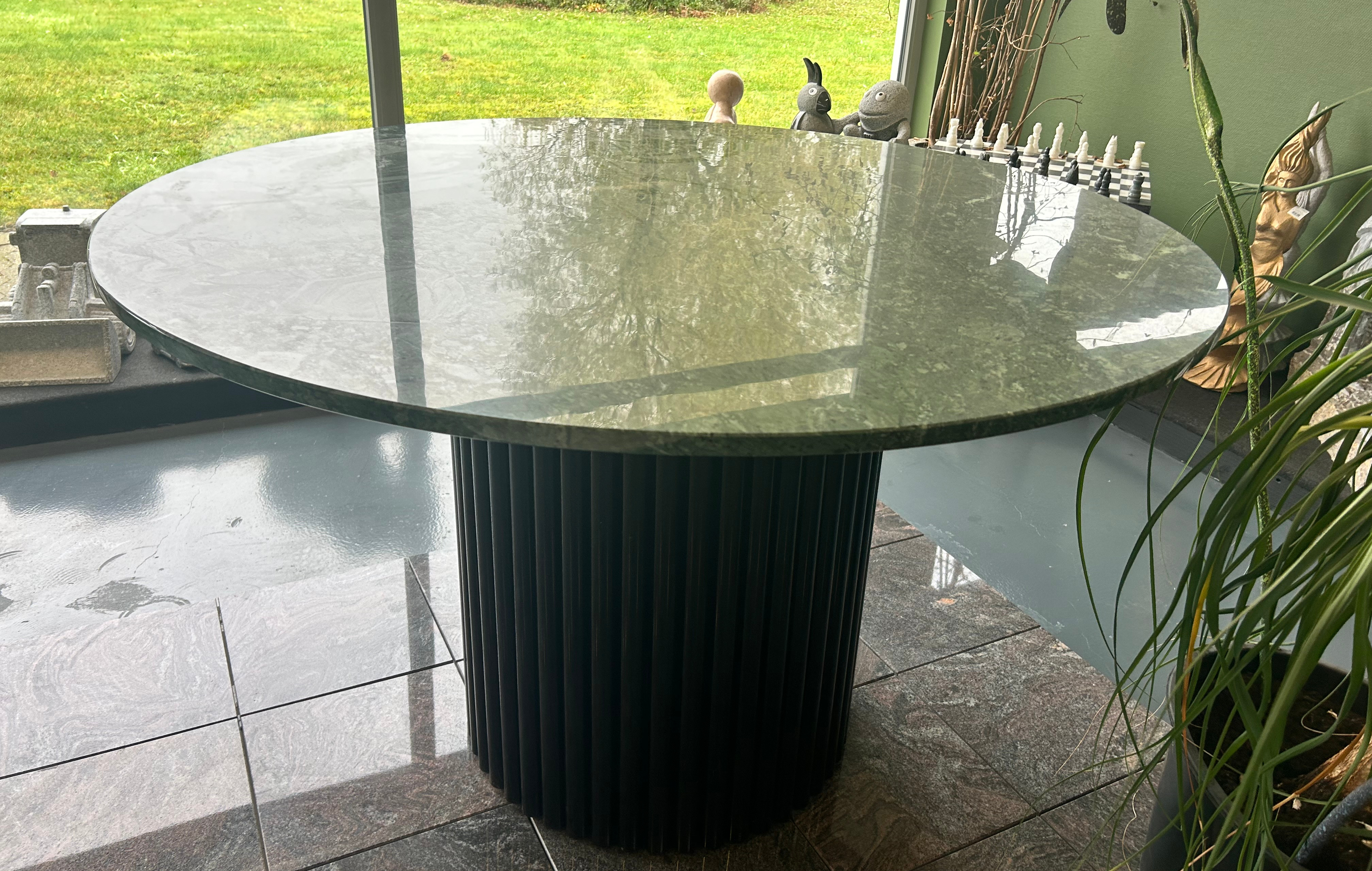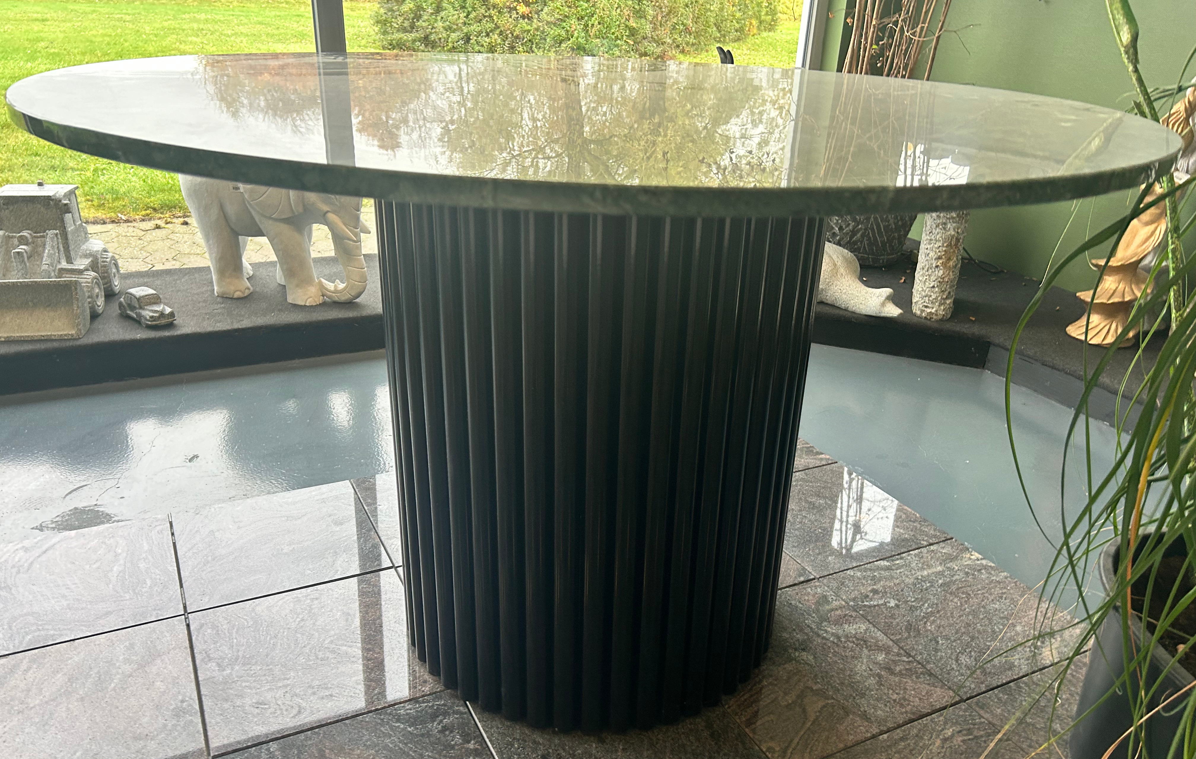 Spisebord med sort stel og grøn marmor Verde Guatemala bordplade. Bordpladen er ikke fastmonteret på stellet, men kan eventuelt gøres ved opsætning.