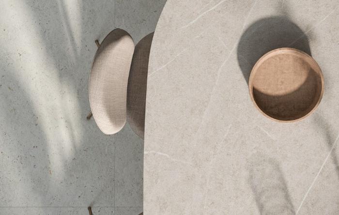 Polar er produceret som en nyfortolkning af Campaspero-stenens naturlige uregelmæssigheder, der kombinerer en levende beige base og cremede åretegninger med diskrete detaljer og fossile elementer.
