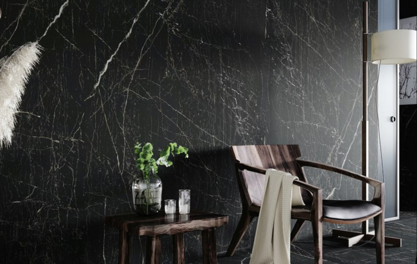 DEKTON plade med detaljer i varme brune og hvide nuancer i en dybsort bund.