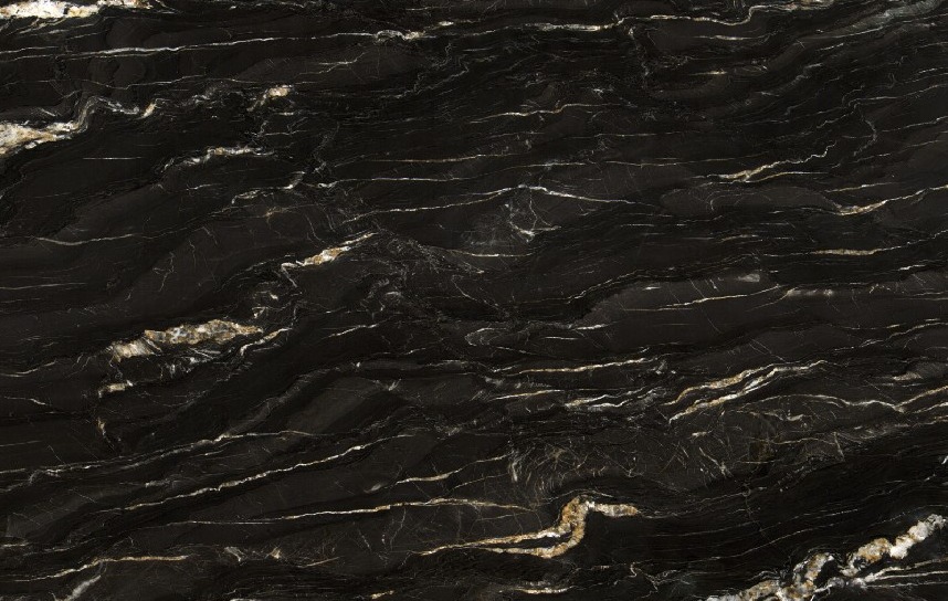 Belvedere kvartsit natursten, der kendes på den dybe, næsten sorte baggrund med levende årer i gyldne, grå og hvide nuancer, som giver et luksuriøst og naturligt spil. Naturstenen har slebet overflade.
