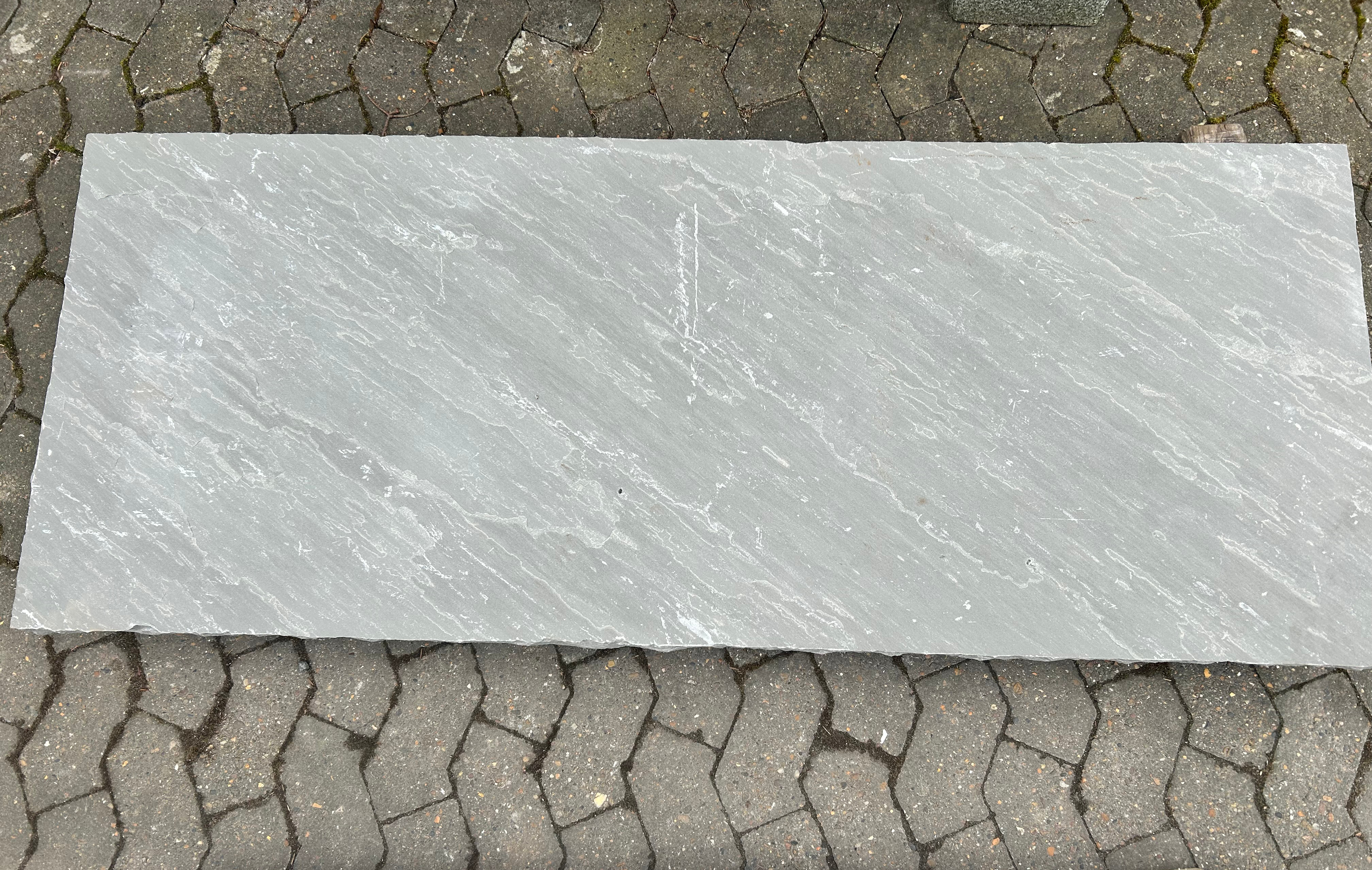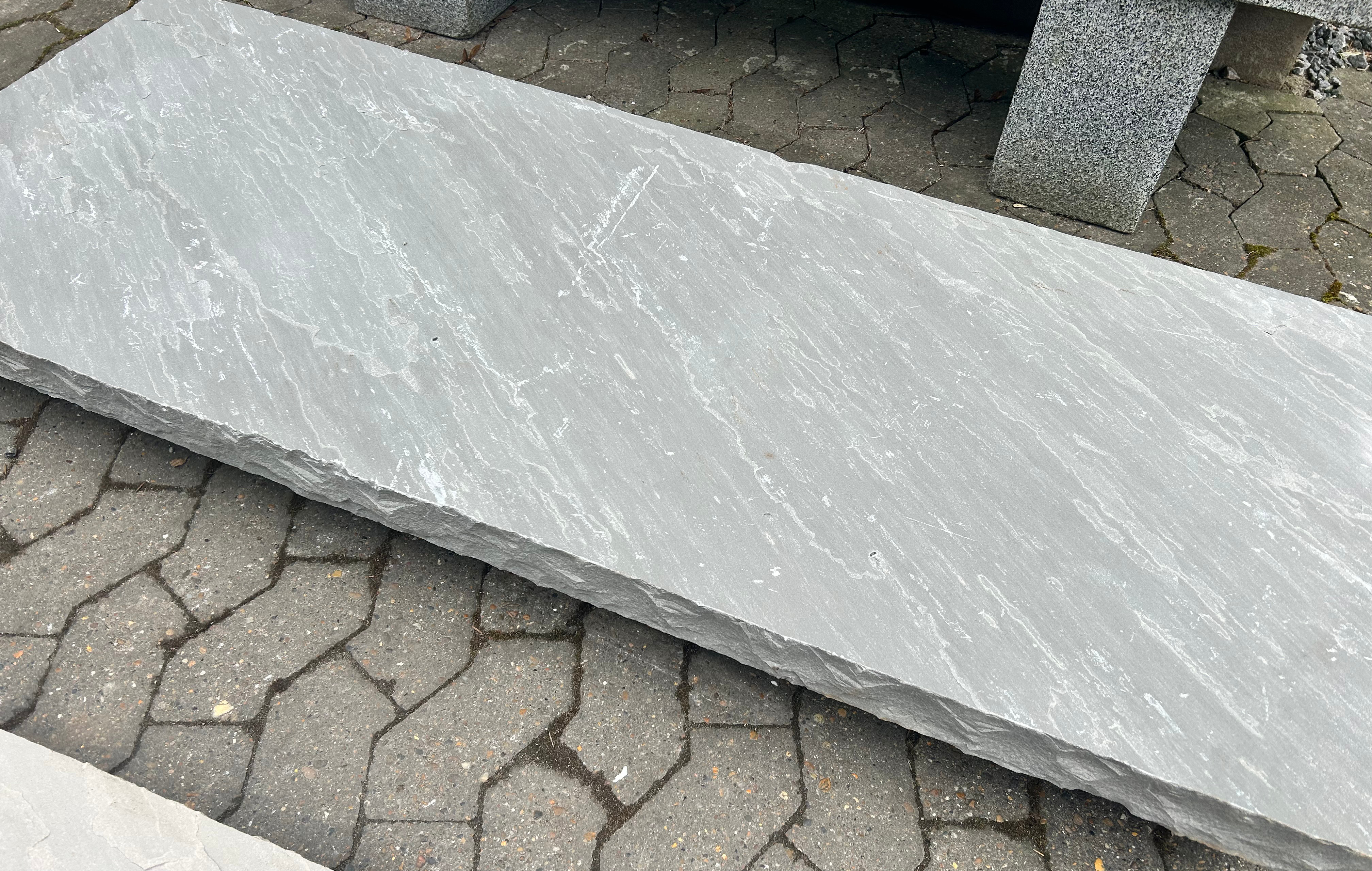 Svelle i grålig sandsten. Pladen har naturkløvet overflade på top, front og to ender. Den kløvede overflade gør at den er skridsikker selv i regnvejr. Kan også bruges som trappetrin, bordplade og meget mere.