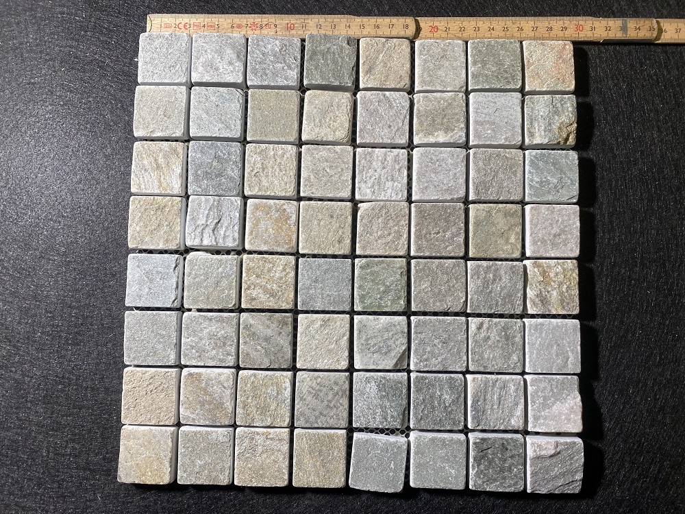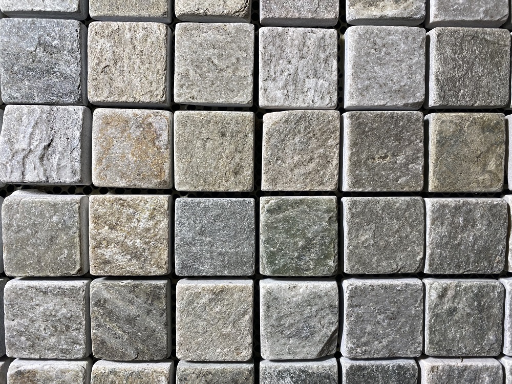 Albino skifer mosaik fliser limet på net. En flot farvevariation på nettet med farver i beige/hvide nuancer. Hvert net måler 30,0 x 30,0 cm sat sammen af små skifer fliser på 3,5 x 3,5 cm. Fliserne har en kløvet overflade, der gør dem mere ru og skridsikre. Mosaikfliserne har en del anvendelsesmuligheder, bl.a. på gulvet eller væggen.