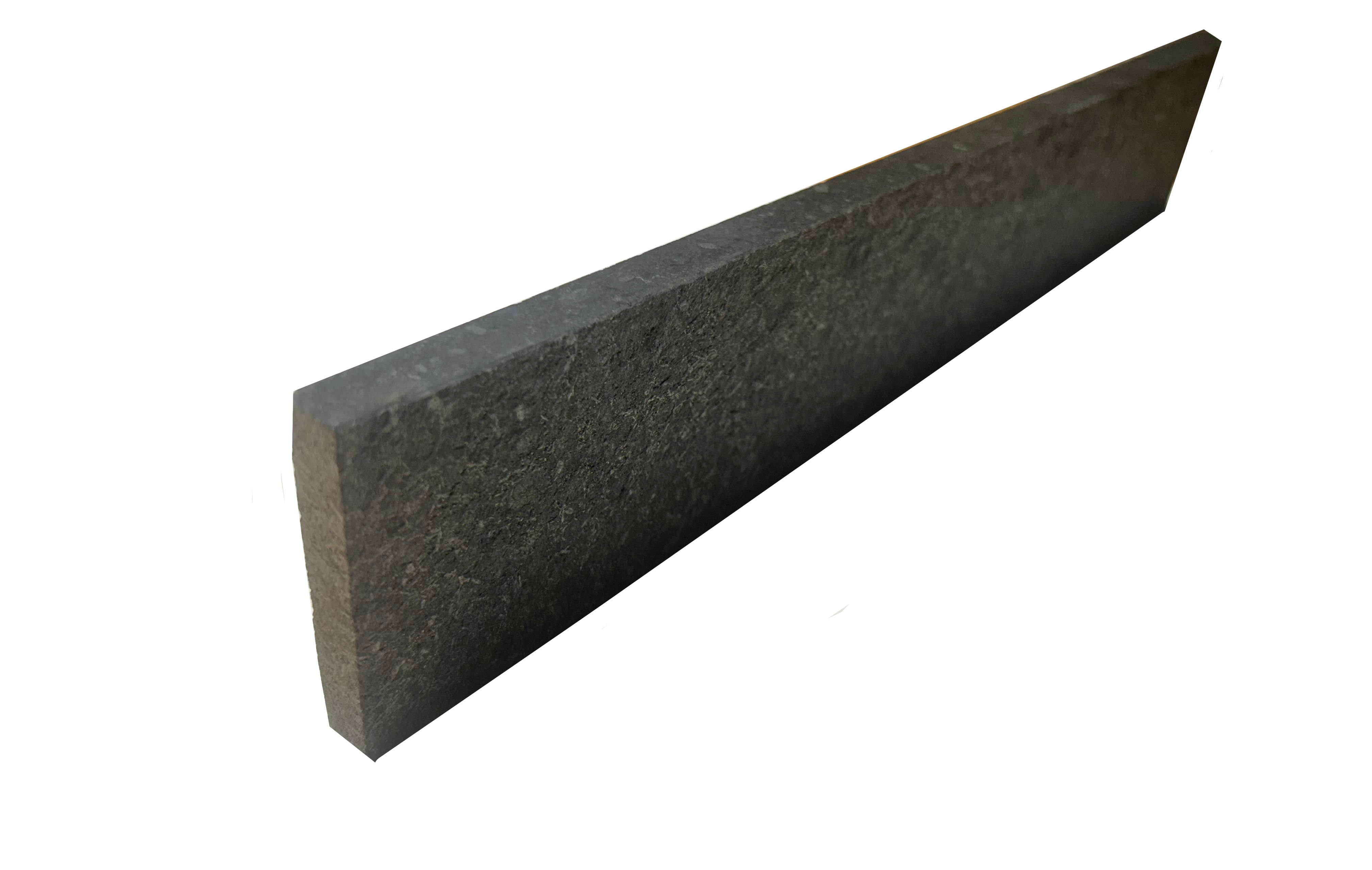 Sokkelflise i sort basalt. Kantflisen har brændt/børstet front og slebet topkant. Monteres som fin afslutning på gulvbelægning eller bordplade.