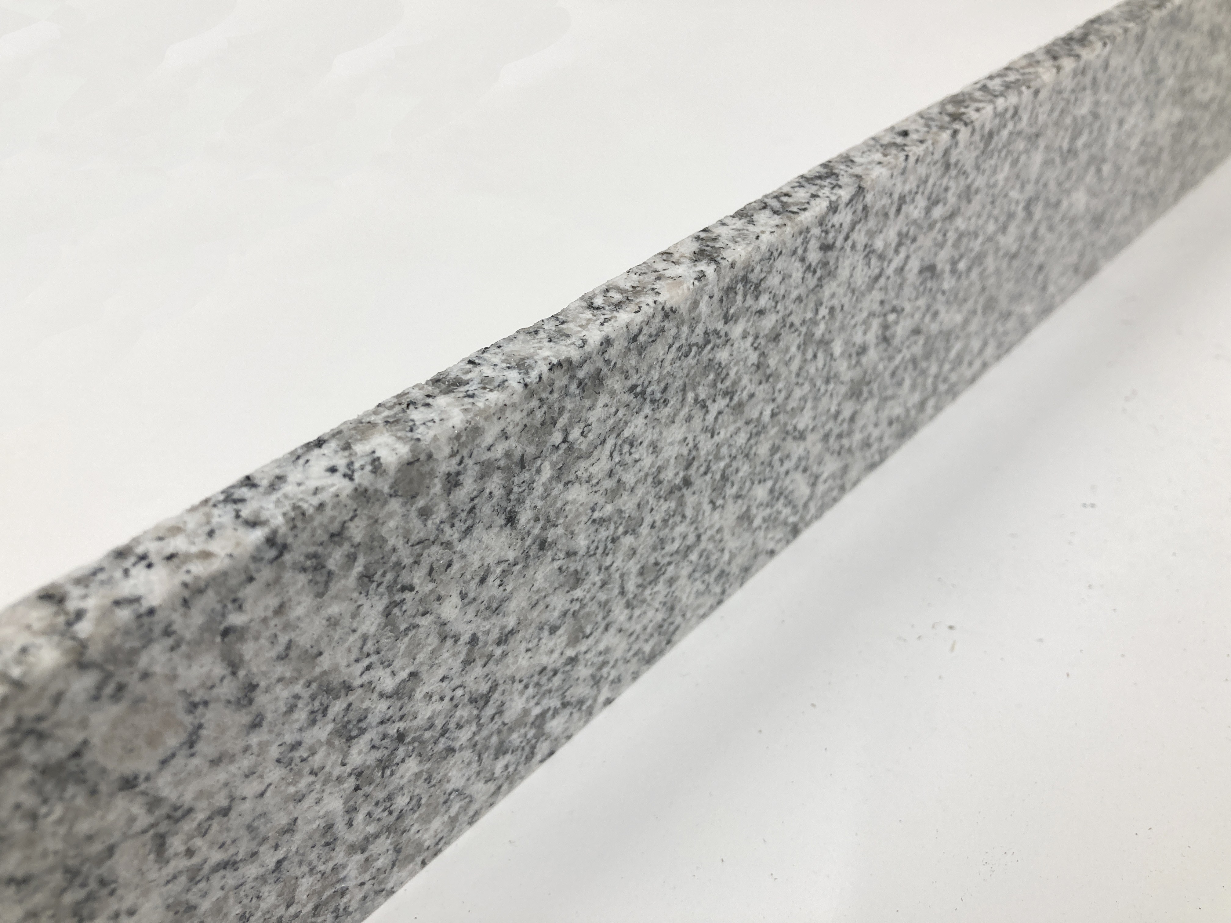 Sokkelflise i lys grå poleret granit. Kantflisen har poleret front og topkant. Monteres som fin afslutning på gulvbelægning eller bordplade.