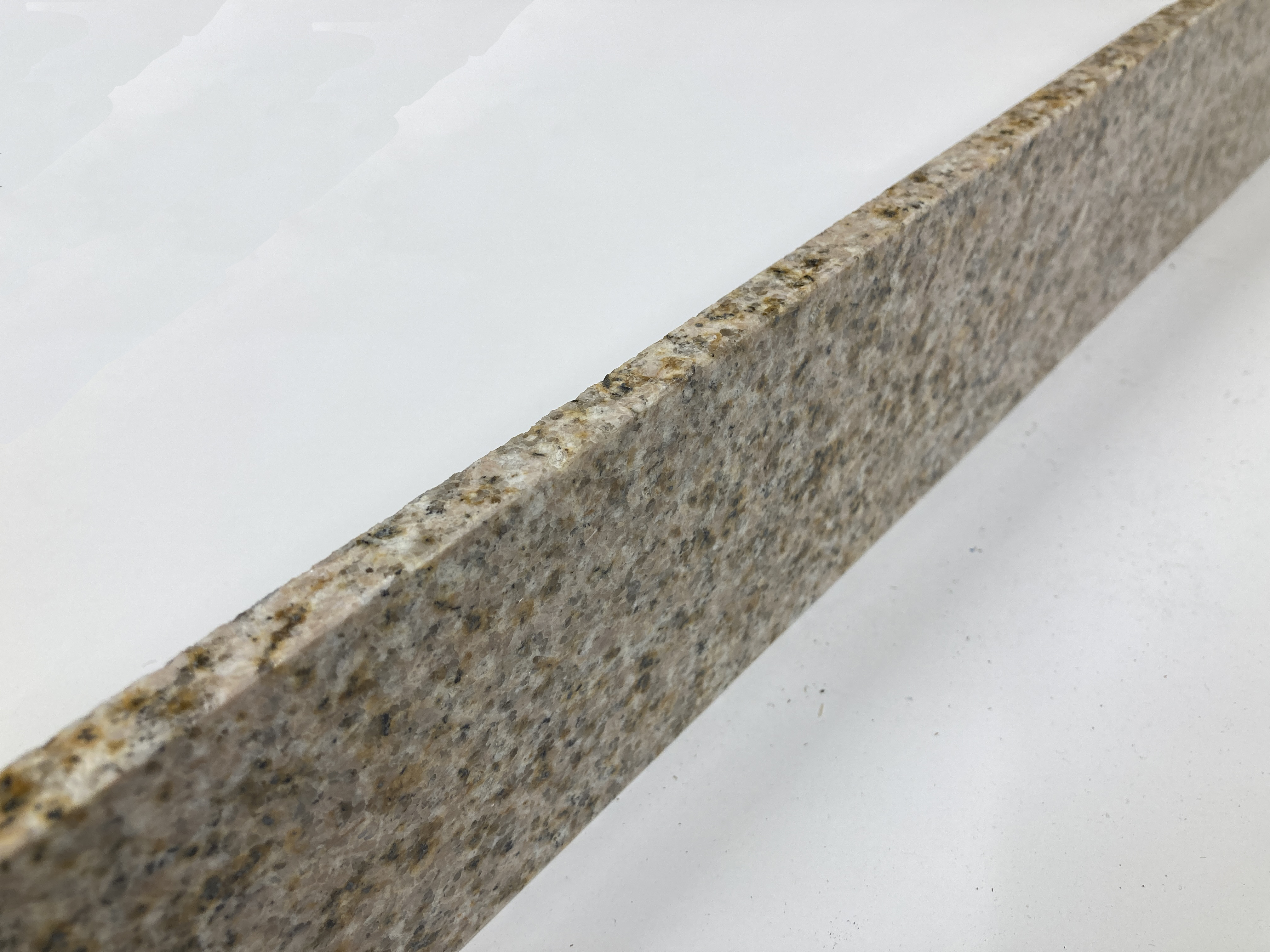 Kant- eller sokkelflise til vægmontering omkring gulvbelægningen eller langs bordplade. Gylden Desert Gold granit med poleret front og topkant. Monter sokkelfliserne med almindelig fliseklæb.