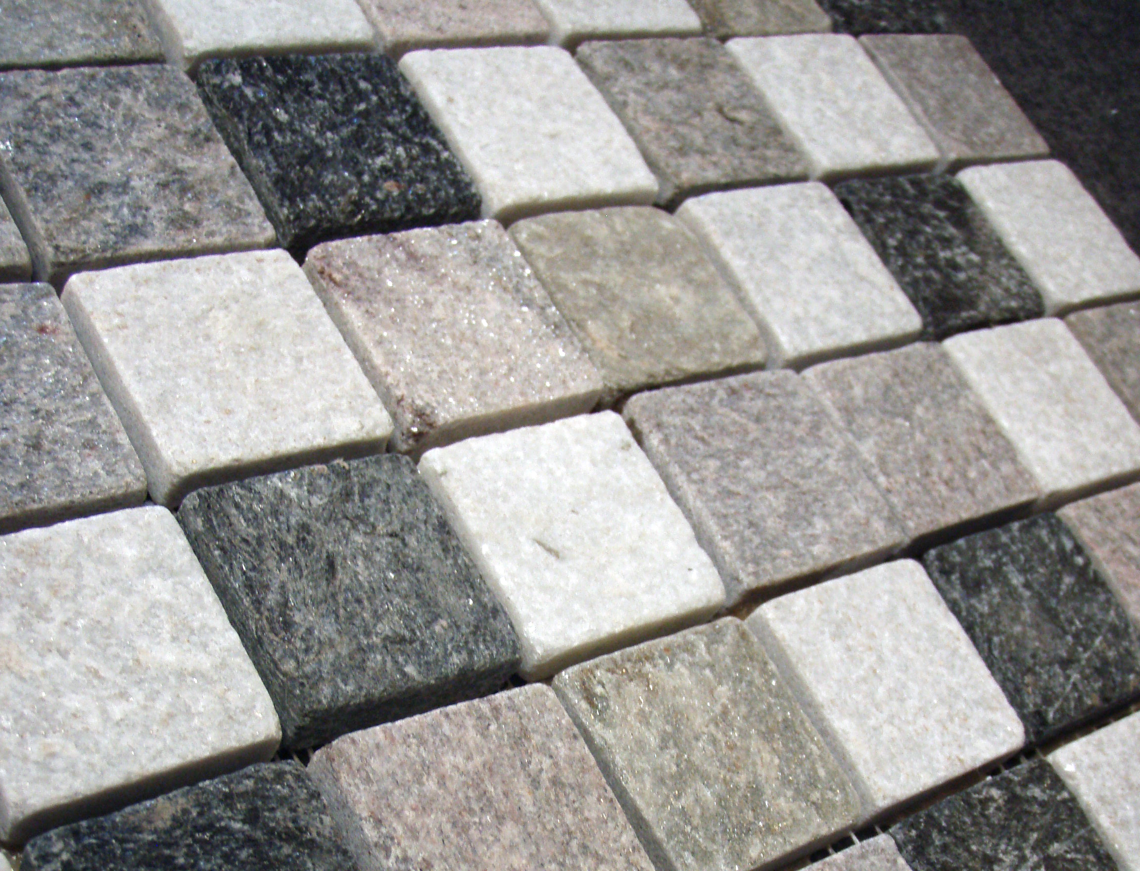 Flerfarvet mosaik i kvarsit monteret på net i tilfældigt mønster. Mosaikken har lidt glimmer i sin overflade, der gør den glitrer, når det kommer i lys eller sol. Lav et spændende gulv eller væg med de flotte farver i fliserne og få samtidigt et rustikt og utroligt holdbart gulv.