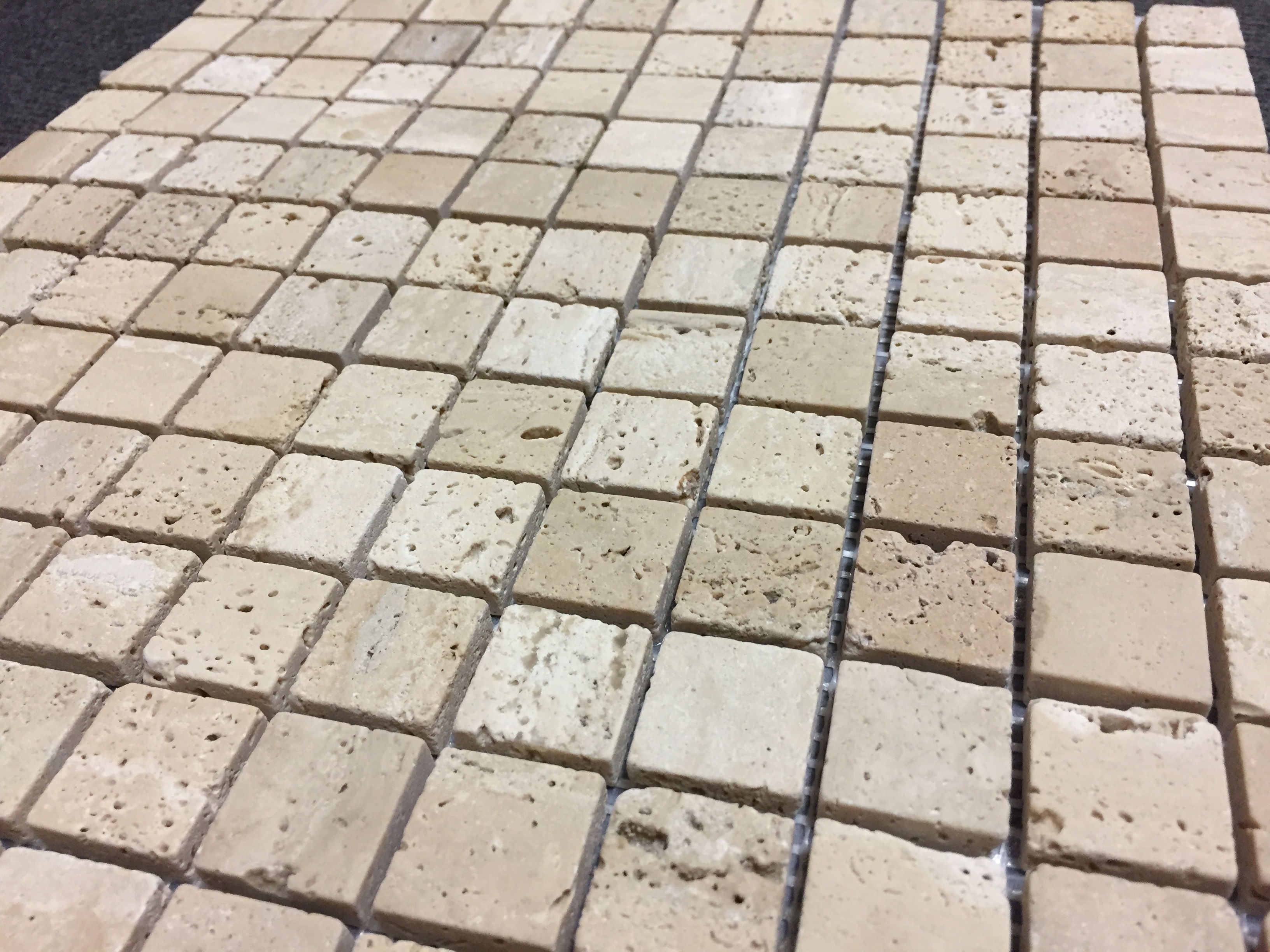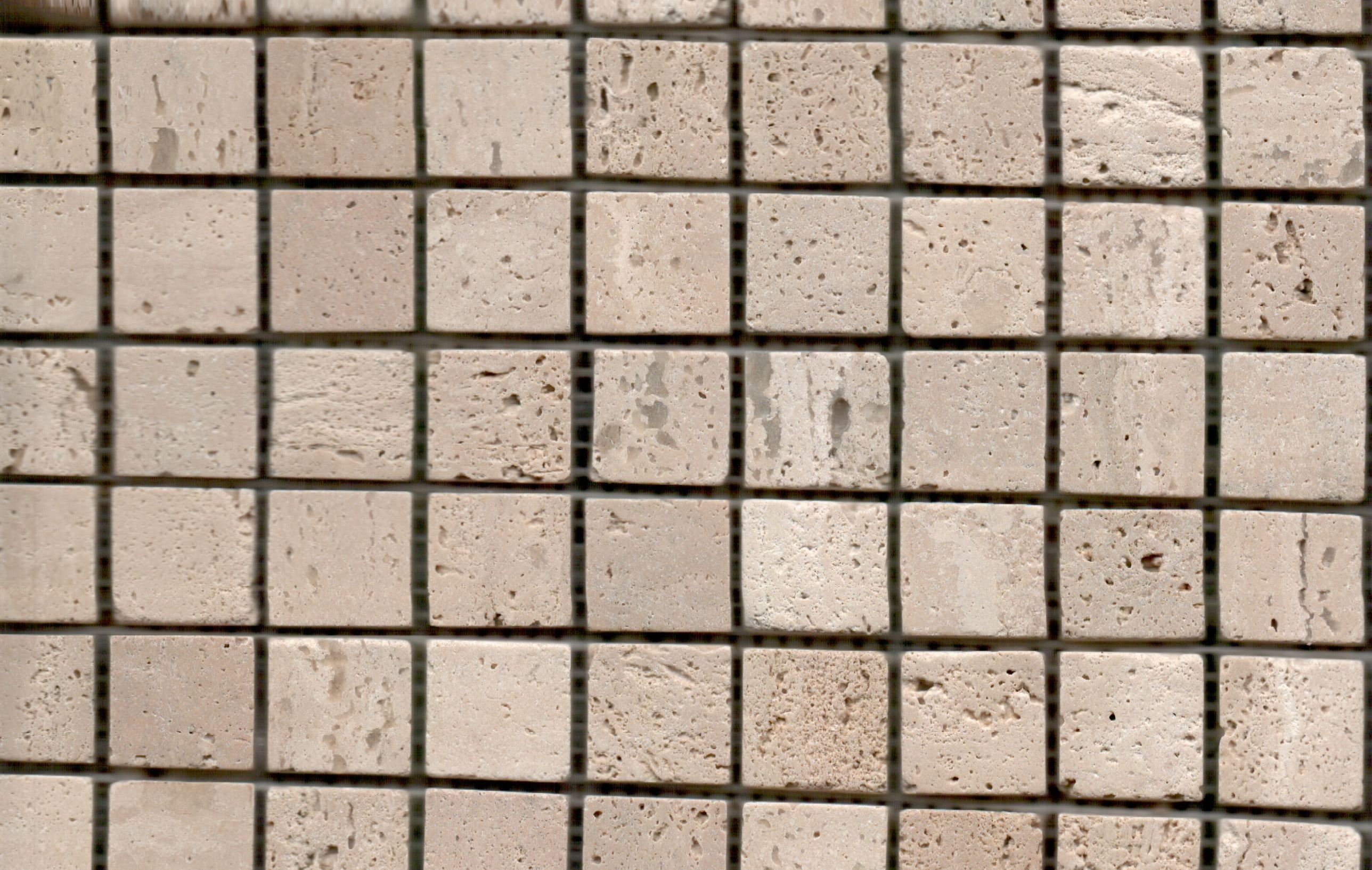 Mosaik til gulv eller væg i flot lys travertin natursten. Mosaik fliserne er limet på net der måler 30,0 x 30,0 cm. De små mosaik sten måler 2,5 x 2,5 cm. Velegnet til både vægge og gulve. Travertin har hullet af natur- nogle vælger det spartlet så hullerne lukkes - denne model har huller. Det tidløse materiale vil være flot i alle husets rum.