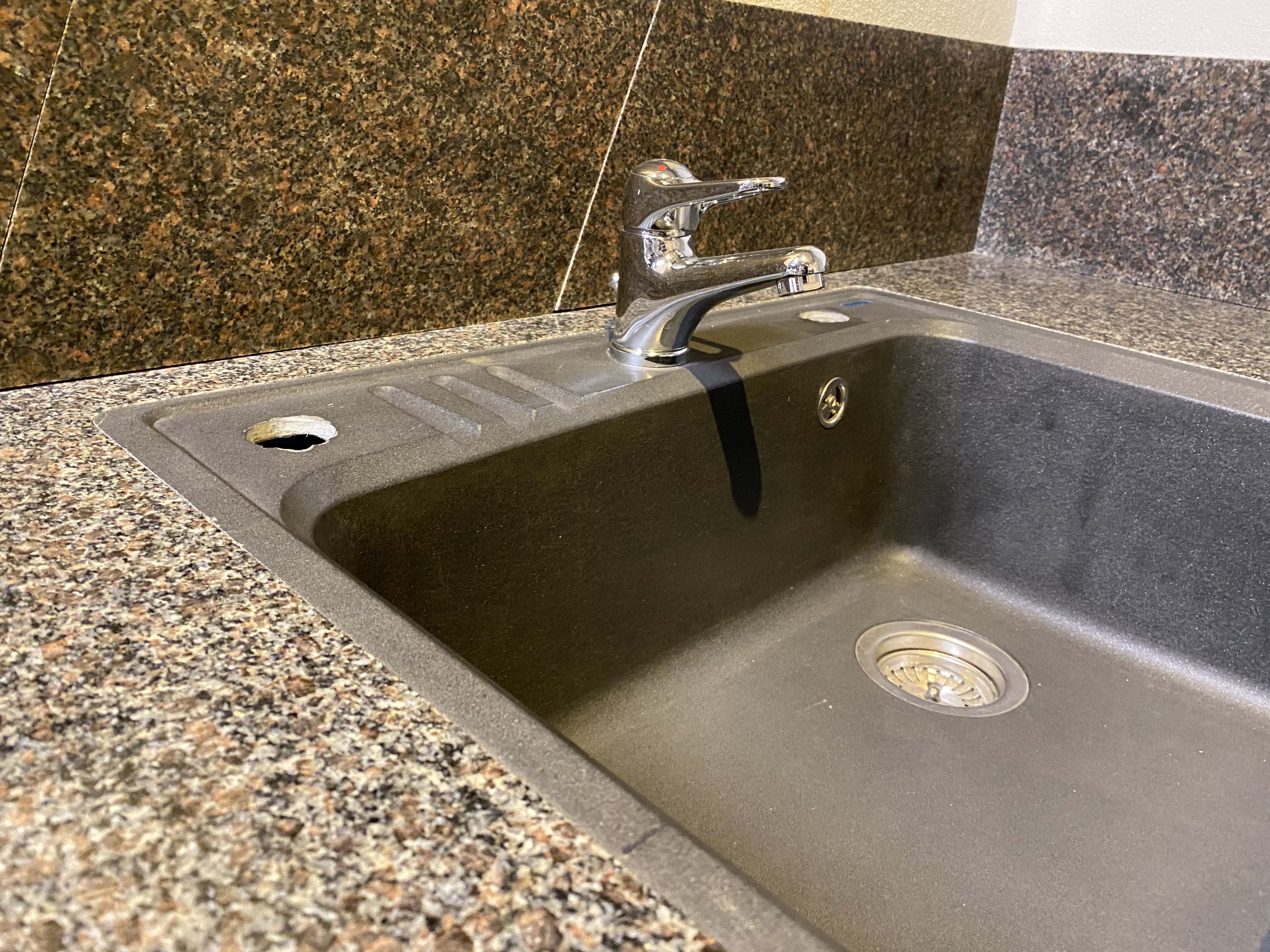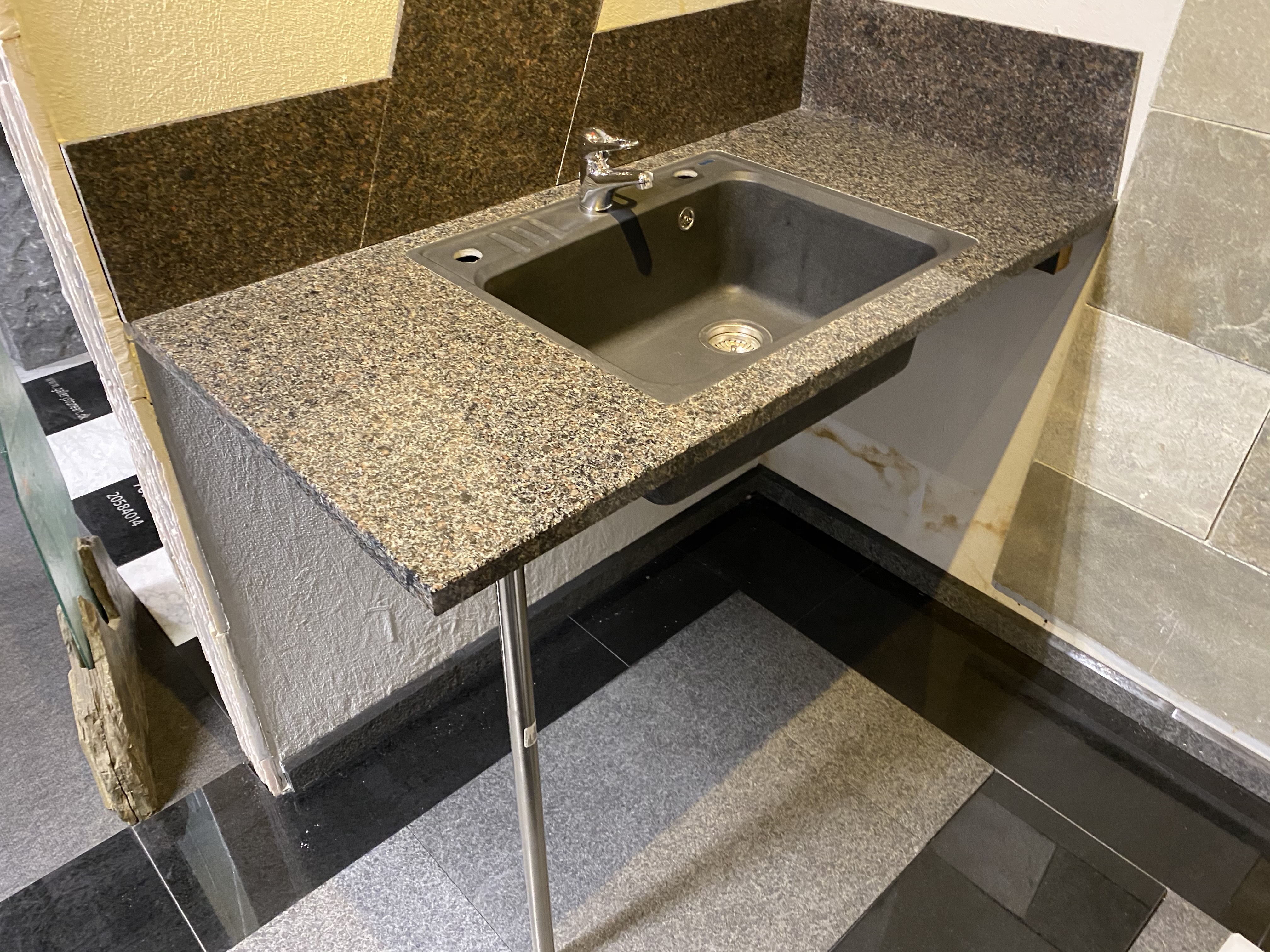 Bordplade med indbygget vask. Bordpladen sidder på væg, dog med stålben der kan følge med. Vasken har 2 ekstra huller til dispenser. Bordpladen er i Mahogni brun/rødlig granit og vil derfor skabe et spil i ethvert hjem med den multifarvede overflade. Bordpladen er poleret og er derfor nem at vedligeholde og rengøre med en fugtig klud.