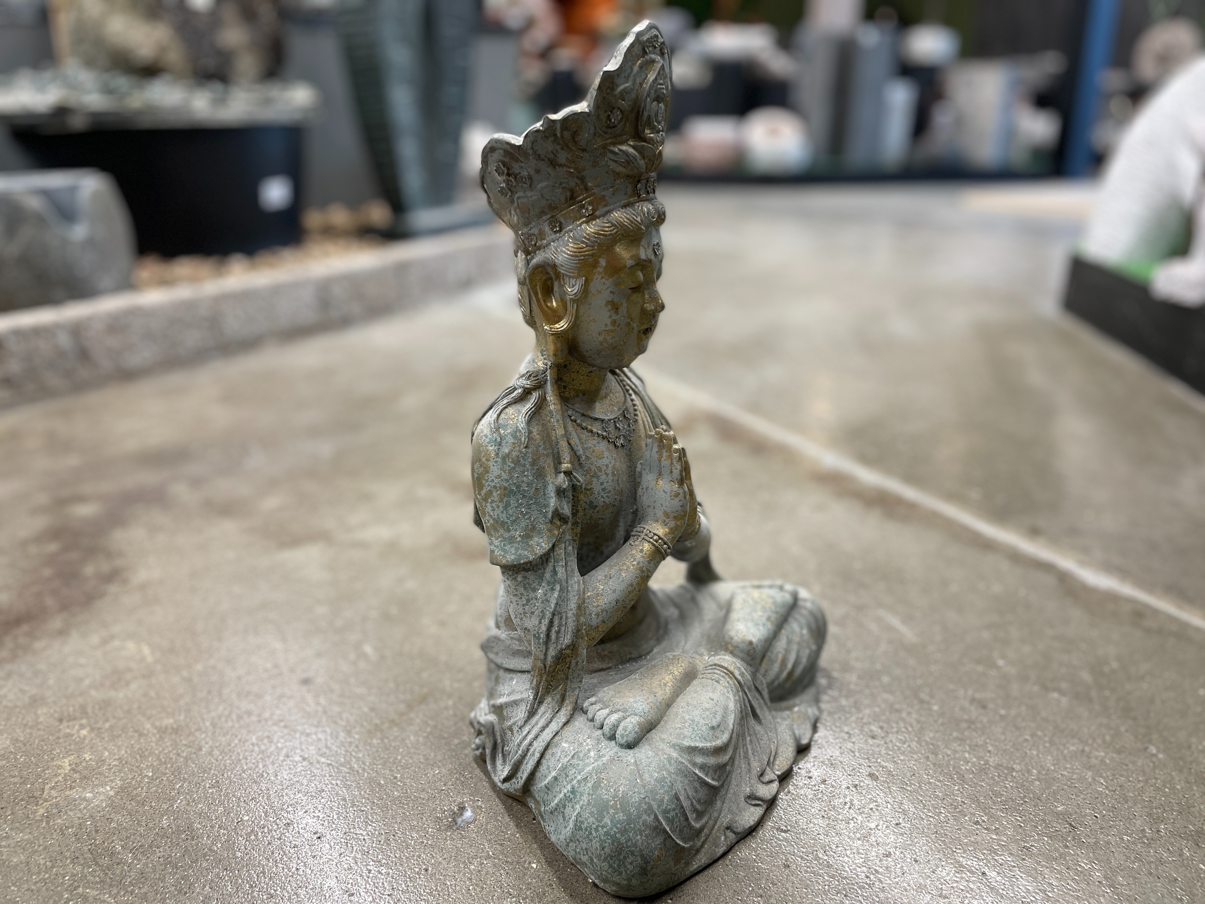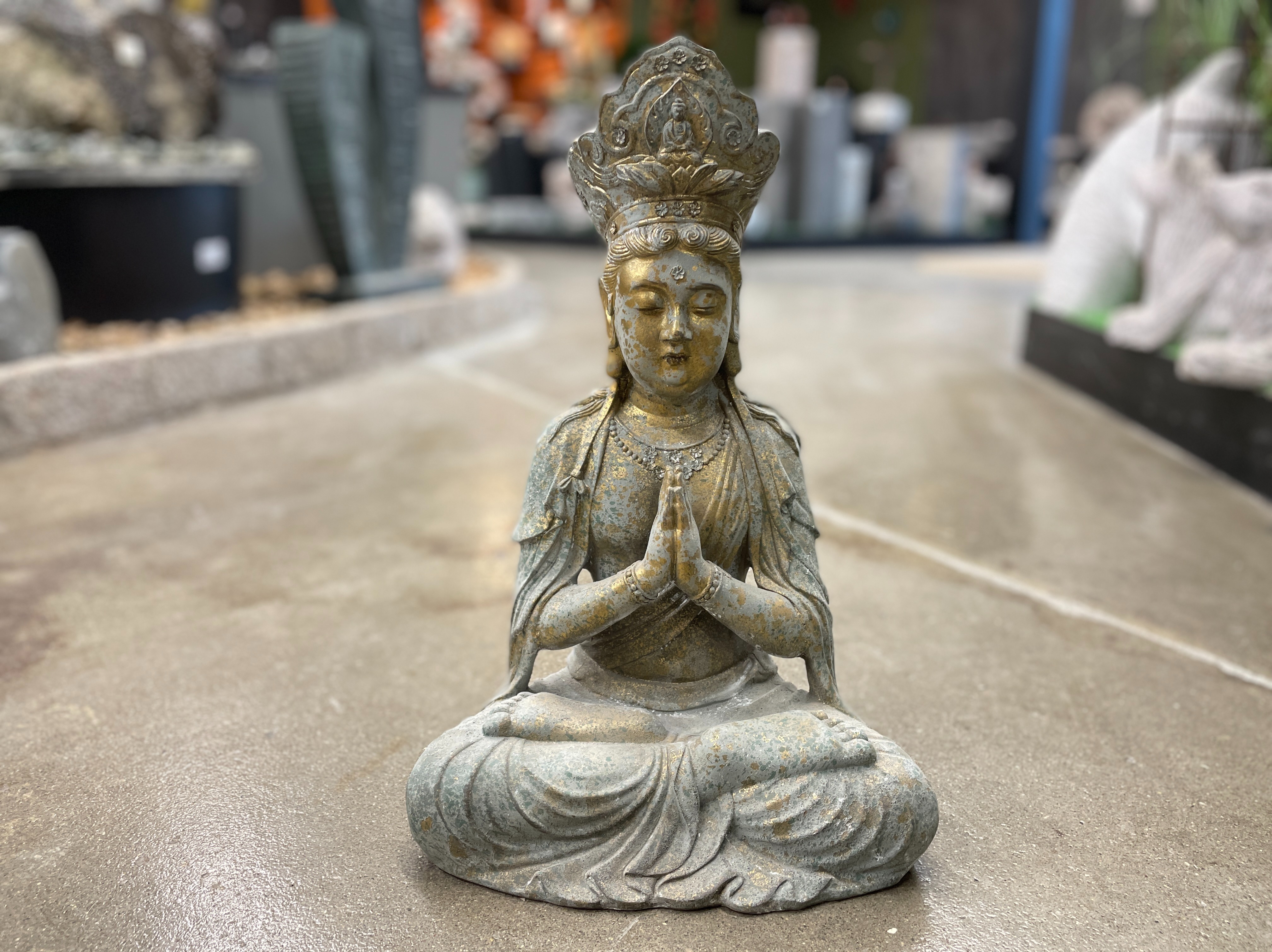 Figur af siddende Buddha i grønlig polyplast med gyldne detaljer