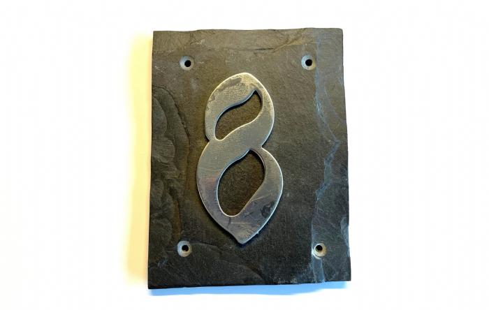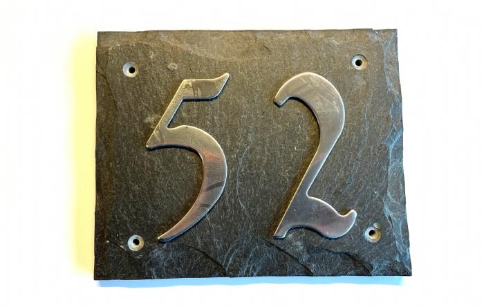 Sorte skiferplader m. huller til montering af metalnumre og bogstaver.