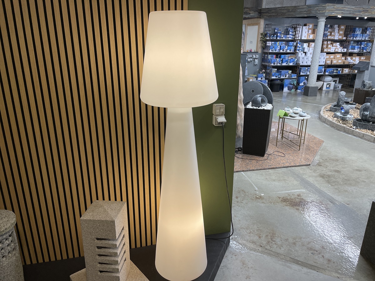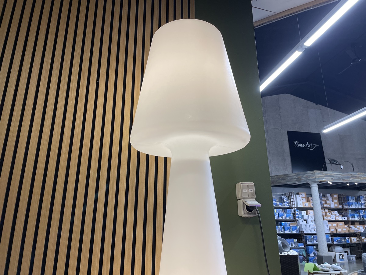 Lampe lavet i hvid plast. Lampen har runde og bløde former med et stel og skærm som går ud i et - giver et behageligt og blødt lys. Lampen kan bruges både inde og ude.