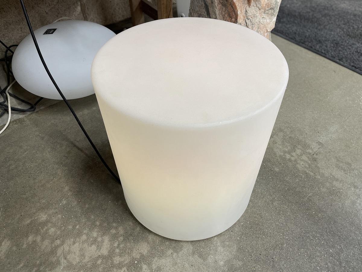 Lampe lavet i hvid plast. Lampen har en cylinderform med bløde og runde former, og giver et behageligt og blødt lys. Lampen kan bruges både inde og ude.