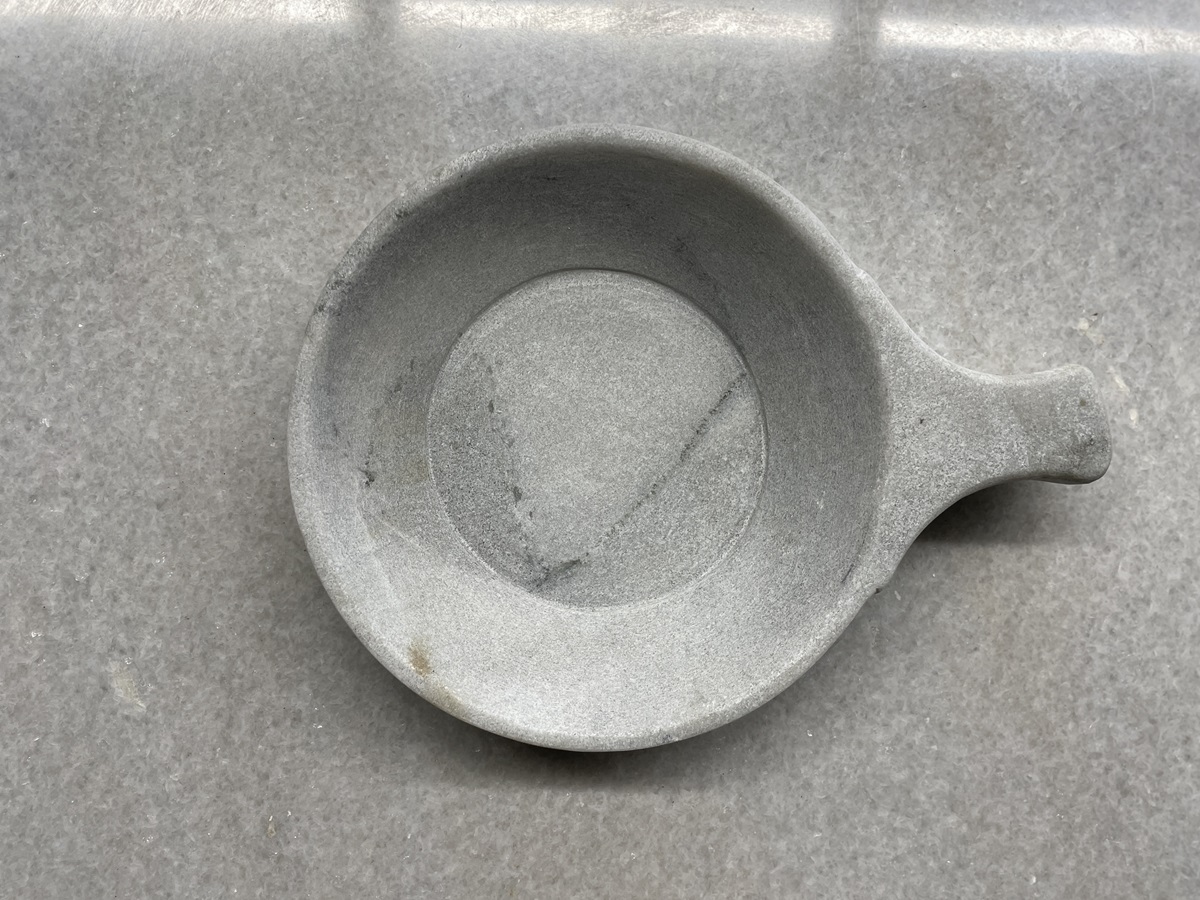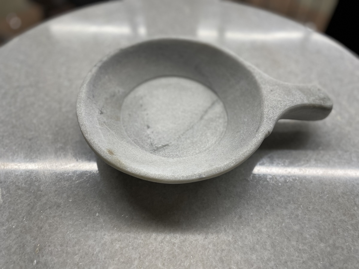 Marmorskål med hank som passer ind på ethvert spisebord eller hylde. Skålen er udskåret i et stykke marmor med hank der tilføjer praktisk anvendelighed. Marmorets naturlige mønstre gør hver skål unik, og dens elegante udseende gør den velegnet som både en dekorativ og funktionel genstand i hjemmet.