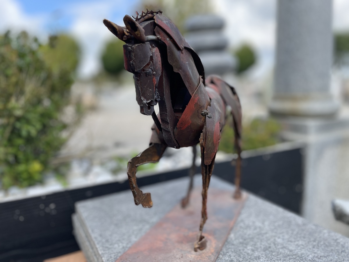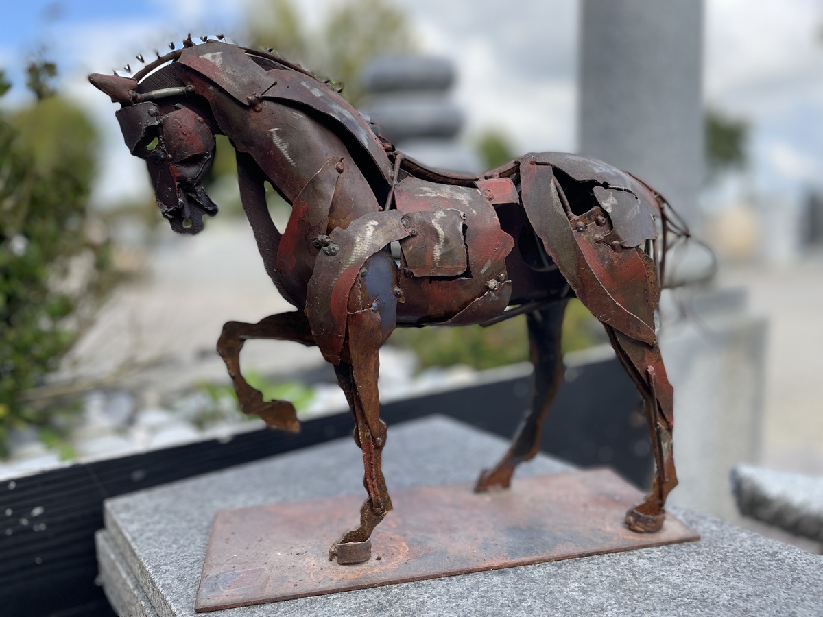 Dekorativ metal hest, med varierende farvespil. Hesten står på en plade, med knejsende hals og har en spændende dimension med "åben krop".