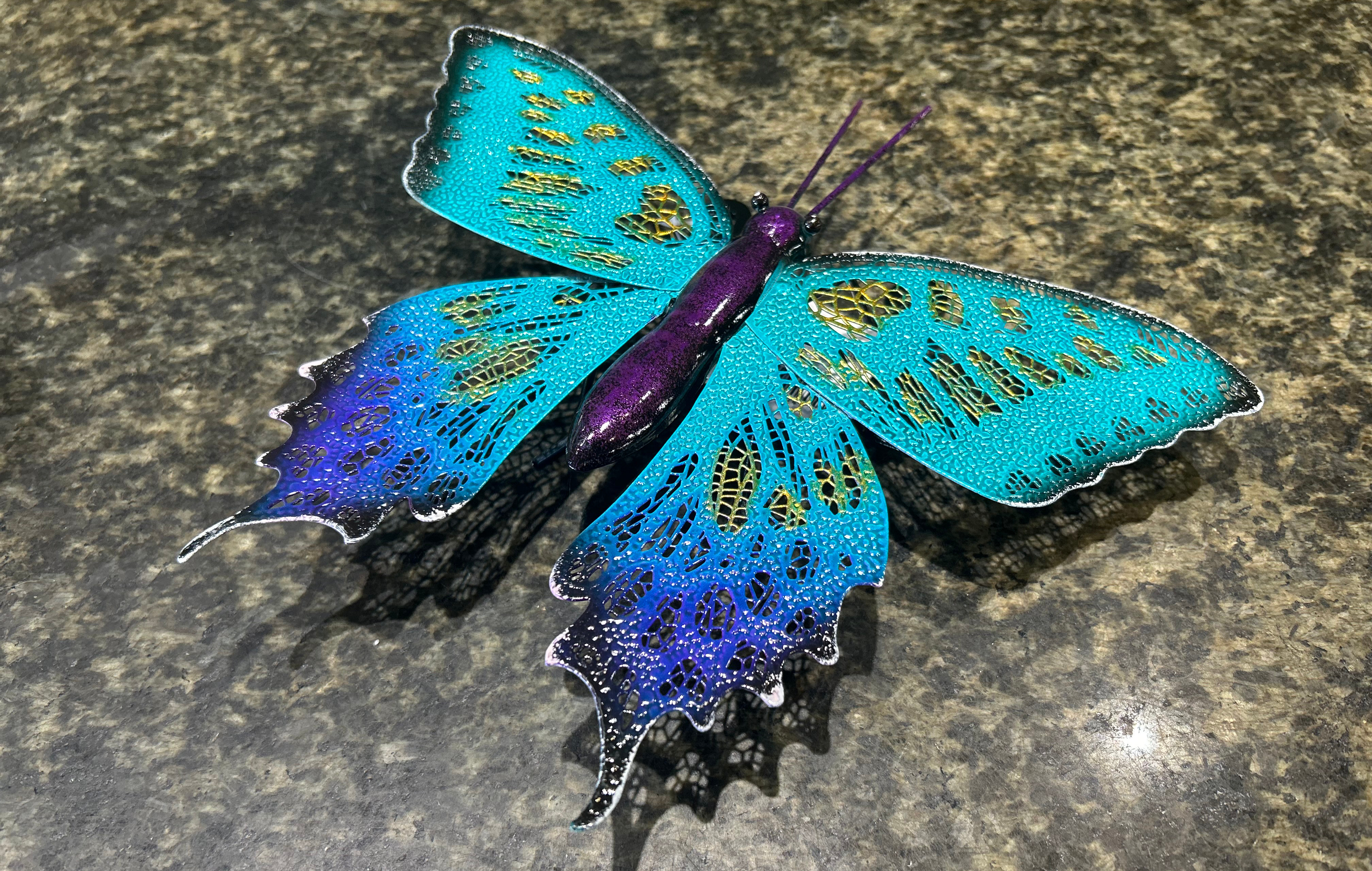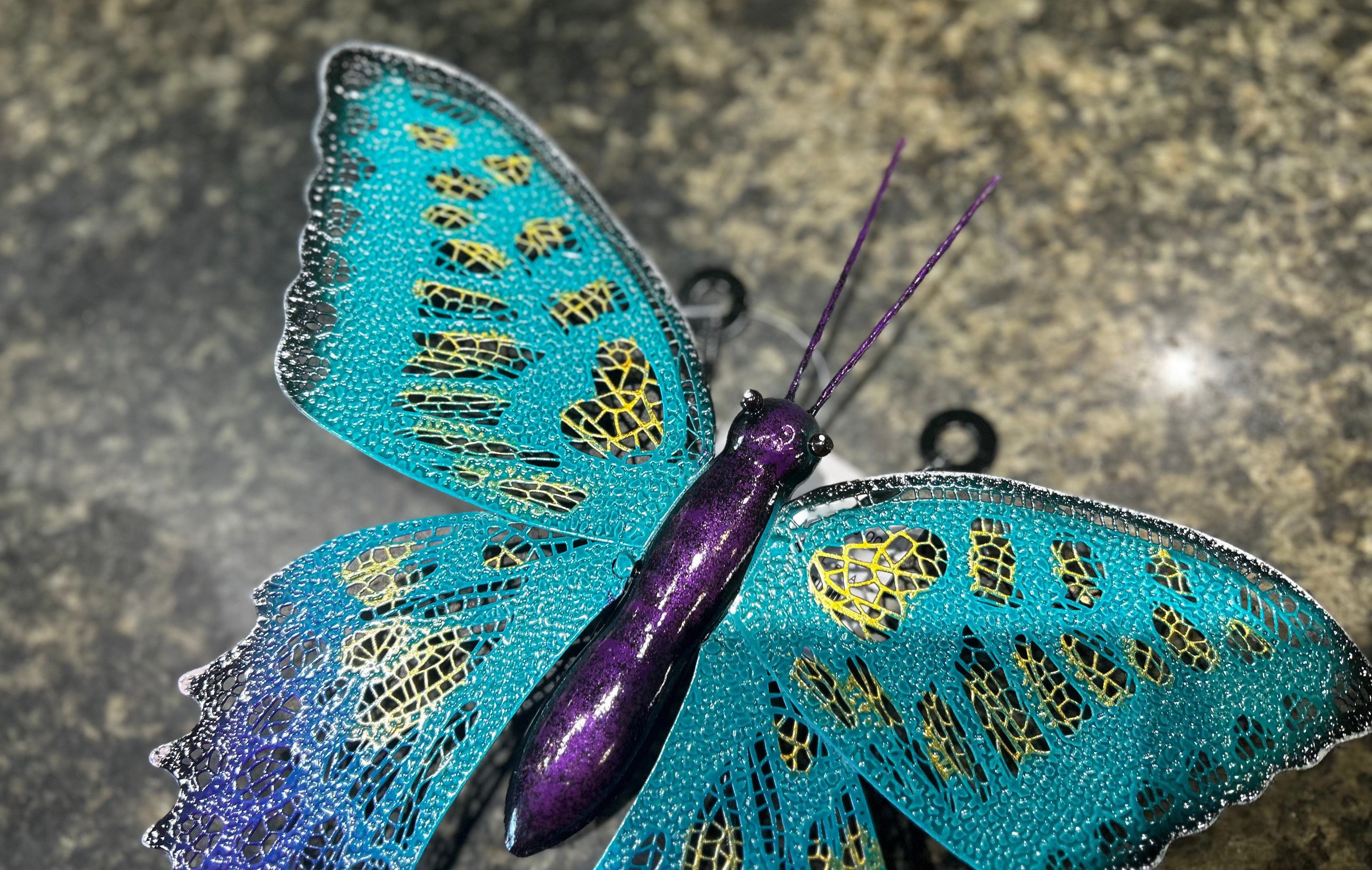 Dekorativ metalsommerfugl til ophæng i blålig. Tilføj farve til hjemmet eller haven med denne metalsommerfugl. Den er kunstfærdigt udført i en levende kombination af turkis, mørkeblå og gyldne detaljer, med udskæringer i vingerne, der giver et let og luftigt udtryk. Egnet til både udendørs og indendørs men kan miste lidt glans med tiden.