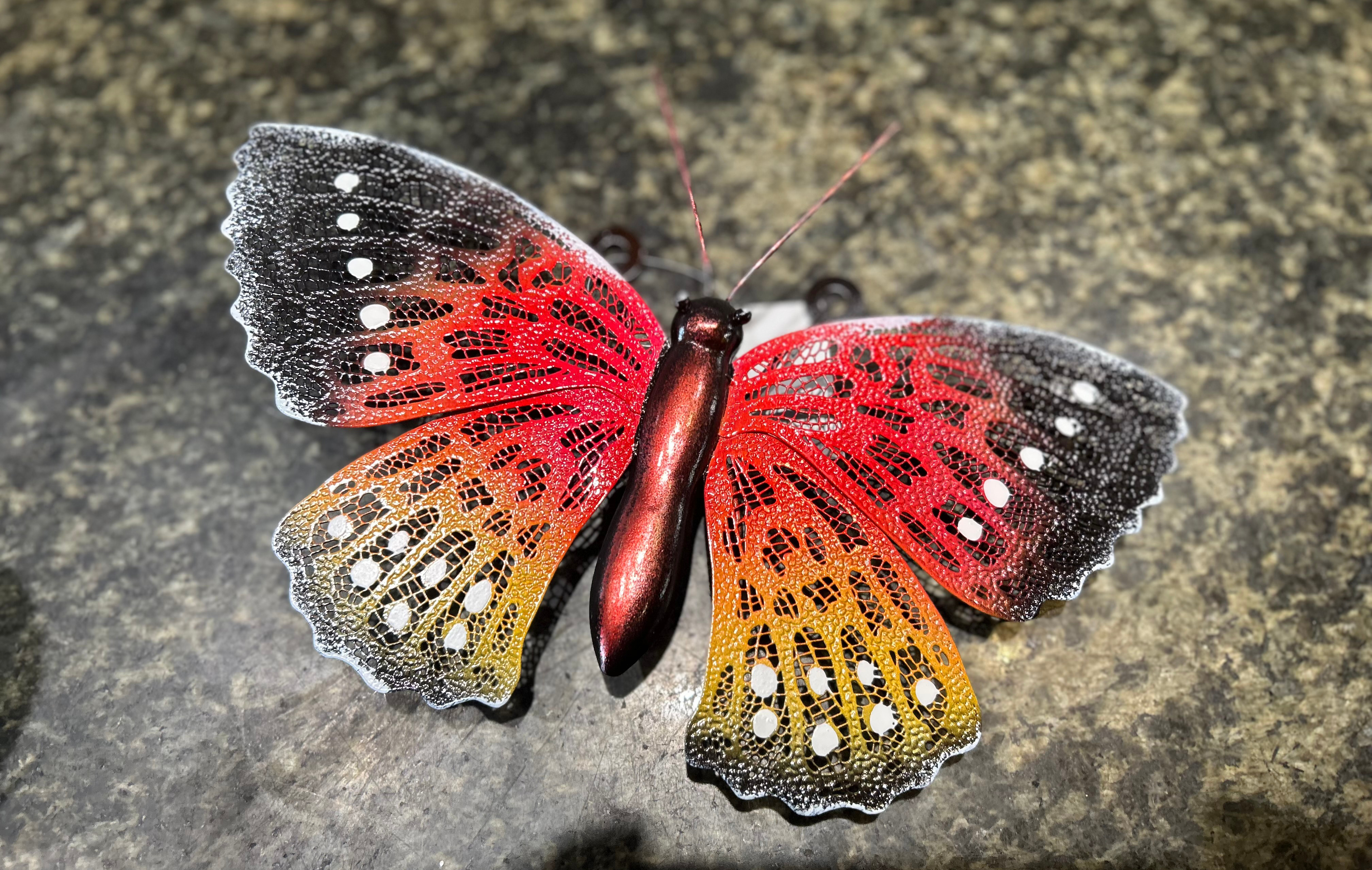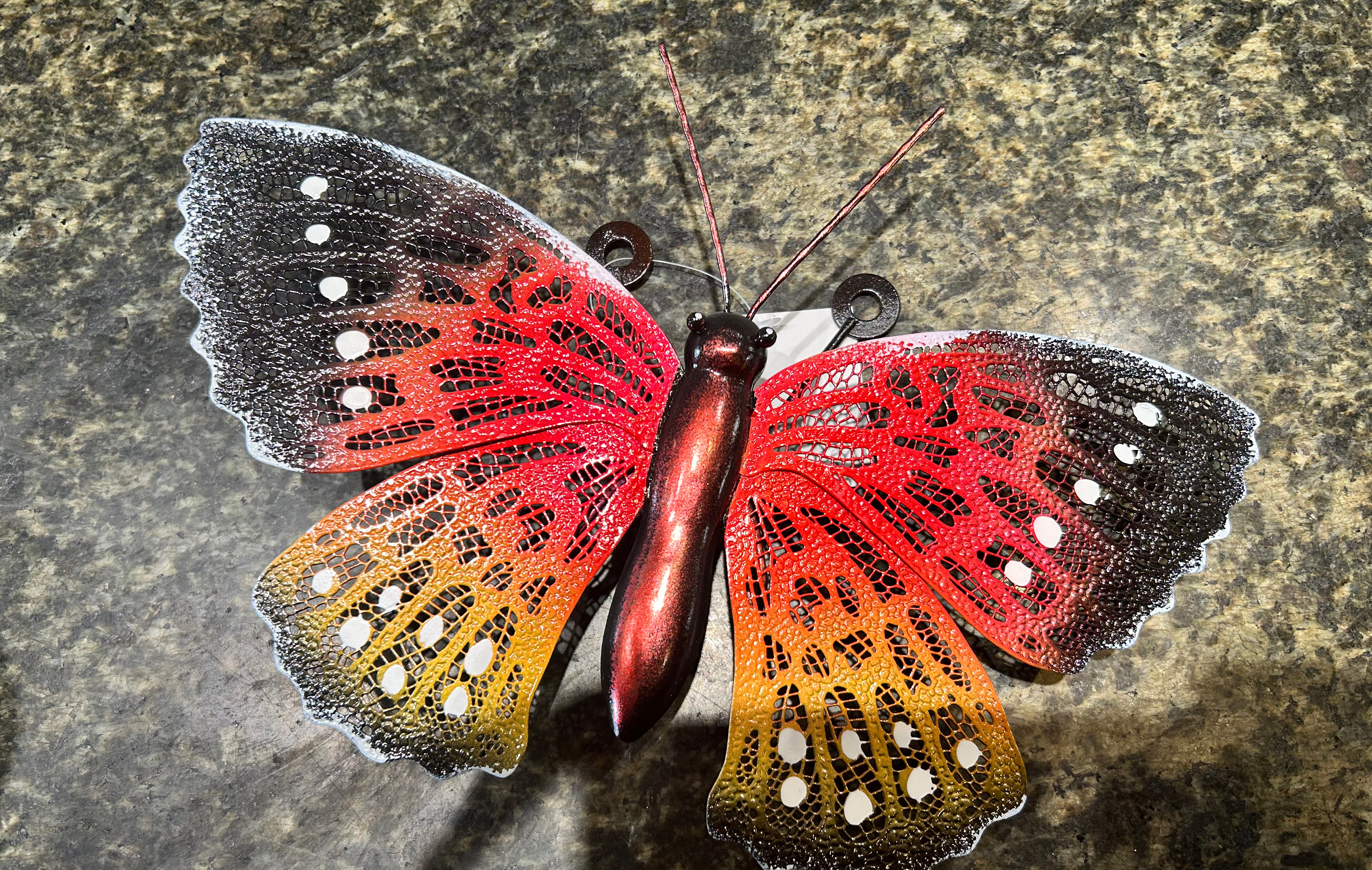 Dekorativ metalsommerfugl til ophæng i rød/orange. Tilføj farve til hjemmet eller haven med denne metalsommerfugl. Den er kunstfærdigt udført i en levende kombination af rød, orange og gyldne detaljer, med udskæringer i vingerne, der giver et let og luftigt udtryk. Egnet til både udendørs og indendørs men kan miste lidt glans med tiden.