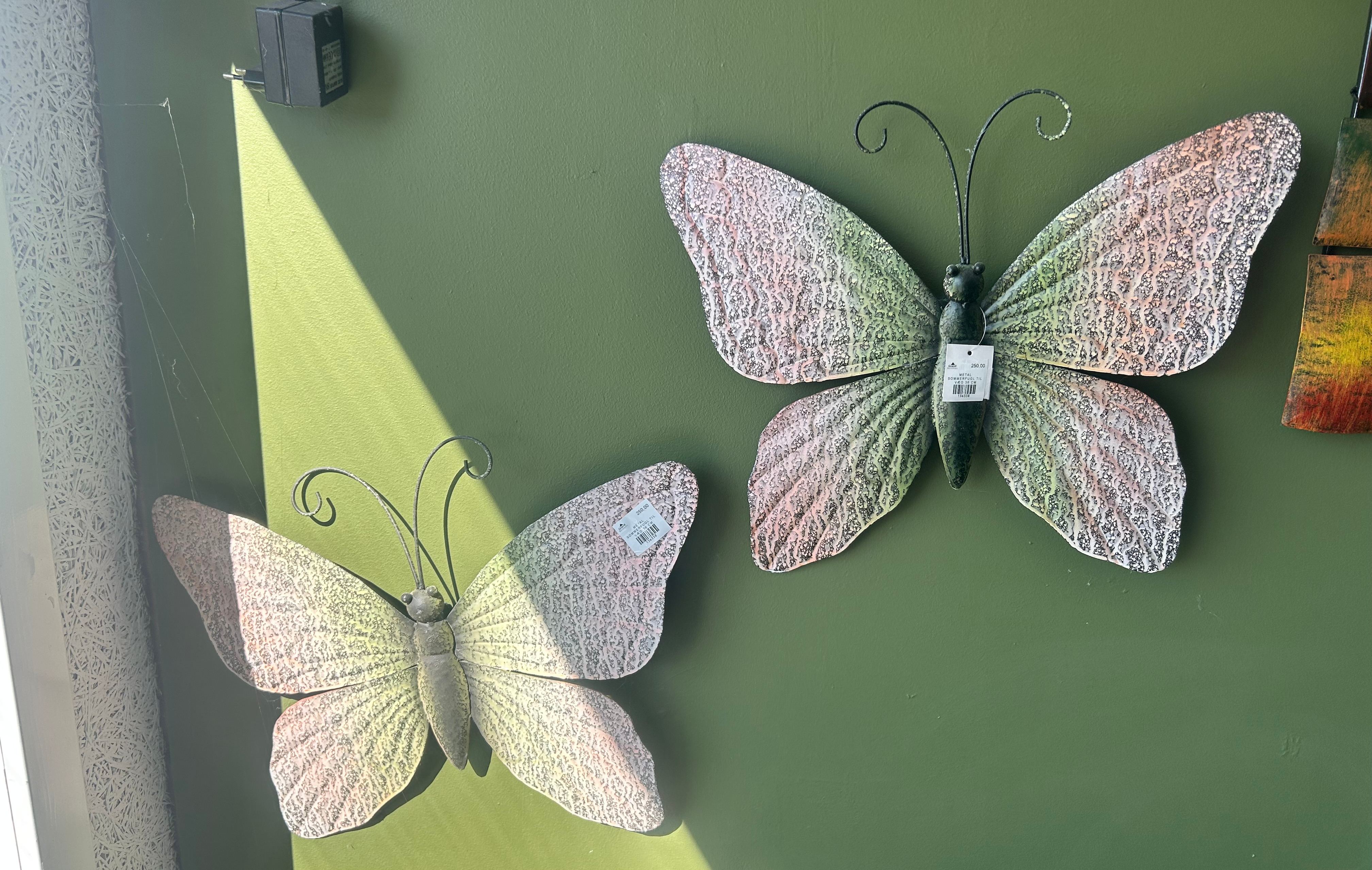Metal sommerfugl til væg ophæng ca. 36 cm. Hver sommerfugl varierer i farvenuancerne.