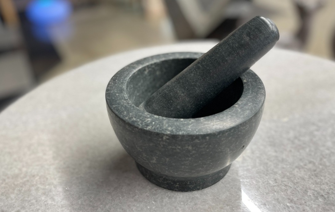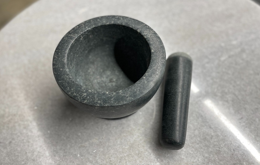 Lille morter i mørkegrå granit med mat poleret overflade. Med sin polerede og glatte overflade er morteren nem at få ren igen efter at have knust de friske krydderurter. Denne morter er udført i granit og er derfor både robust og praktisk i køkkenet. Støder i samme materiale medfølger. Få det optimale ud af dine krydderiblandinger ved selv at knuse dem i en stenmorter.