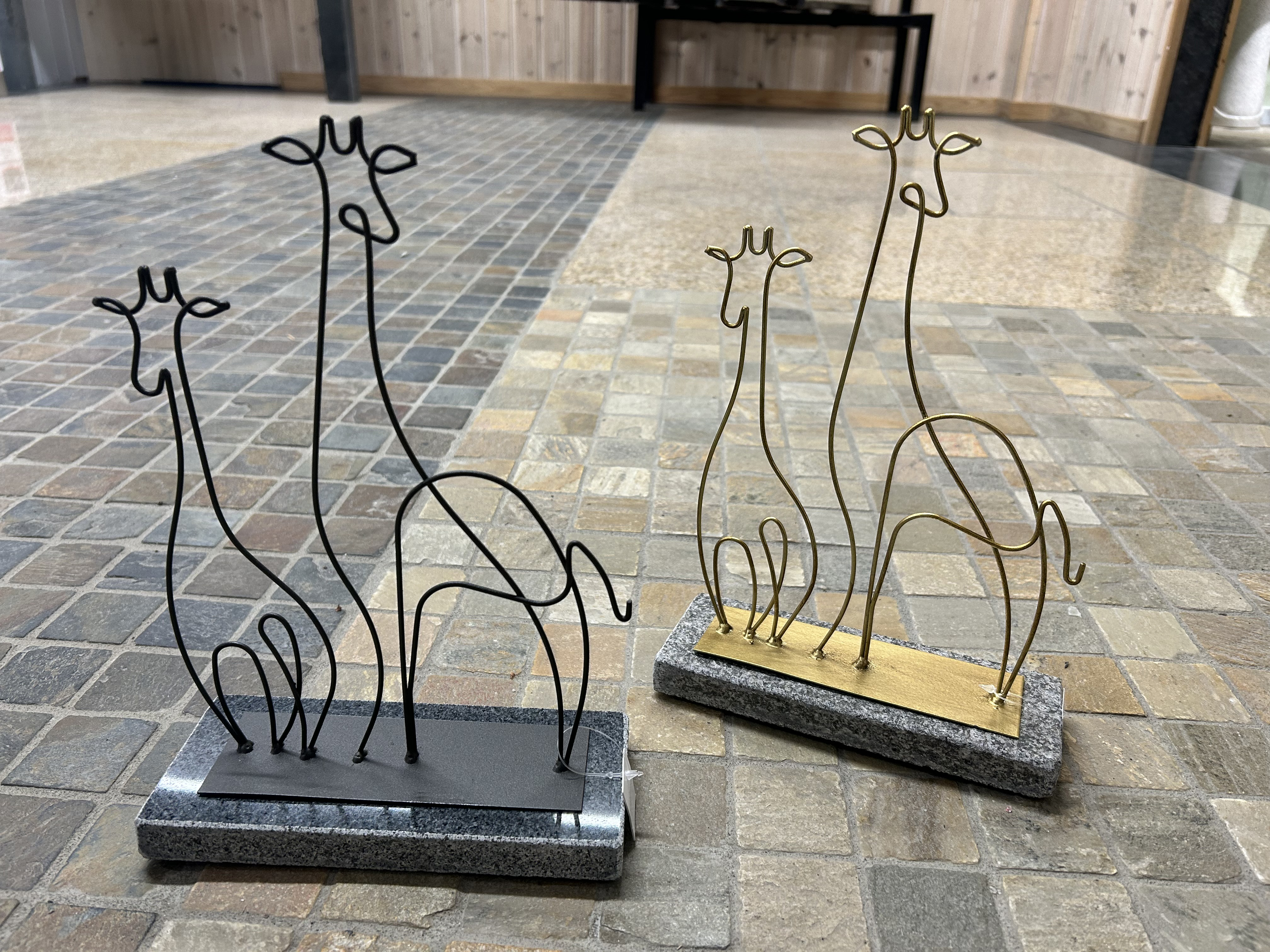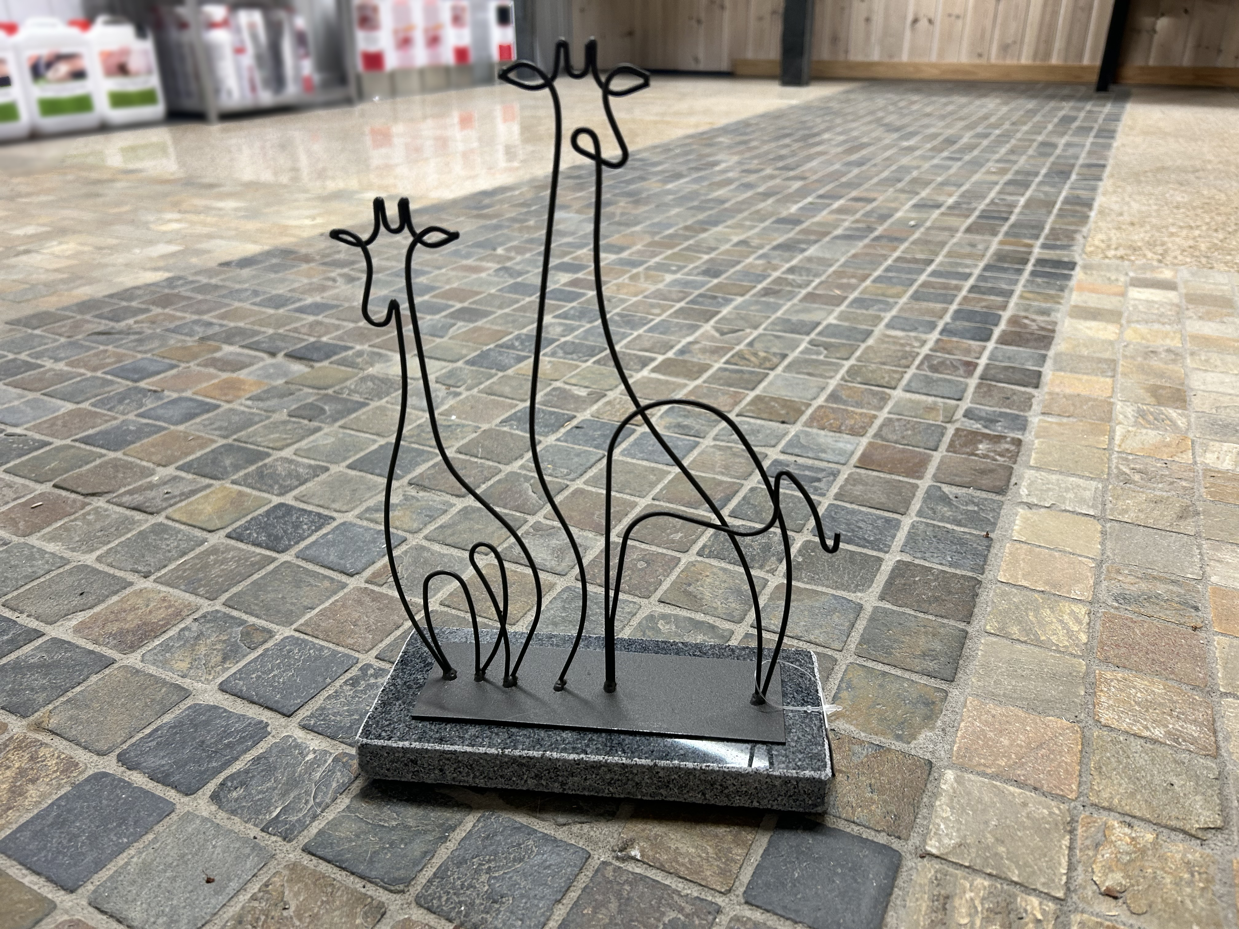 Tråd giraffer på granitsokkel, som fås enten i mat sort eller blank gylden. Trådgirafferne er fastgjort på en gråsort granitplade. De stilrene giraffer har enkle kurvede linjer, der markerer deres lange hals, ben og hoveder med små horn.