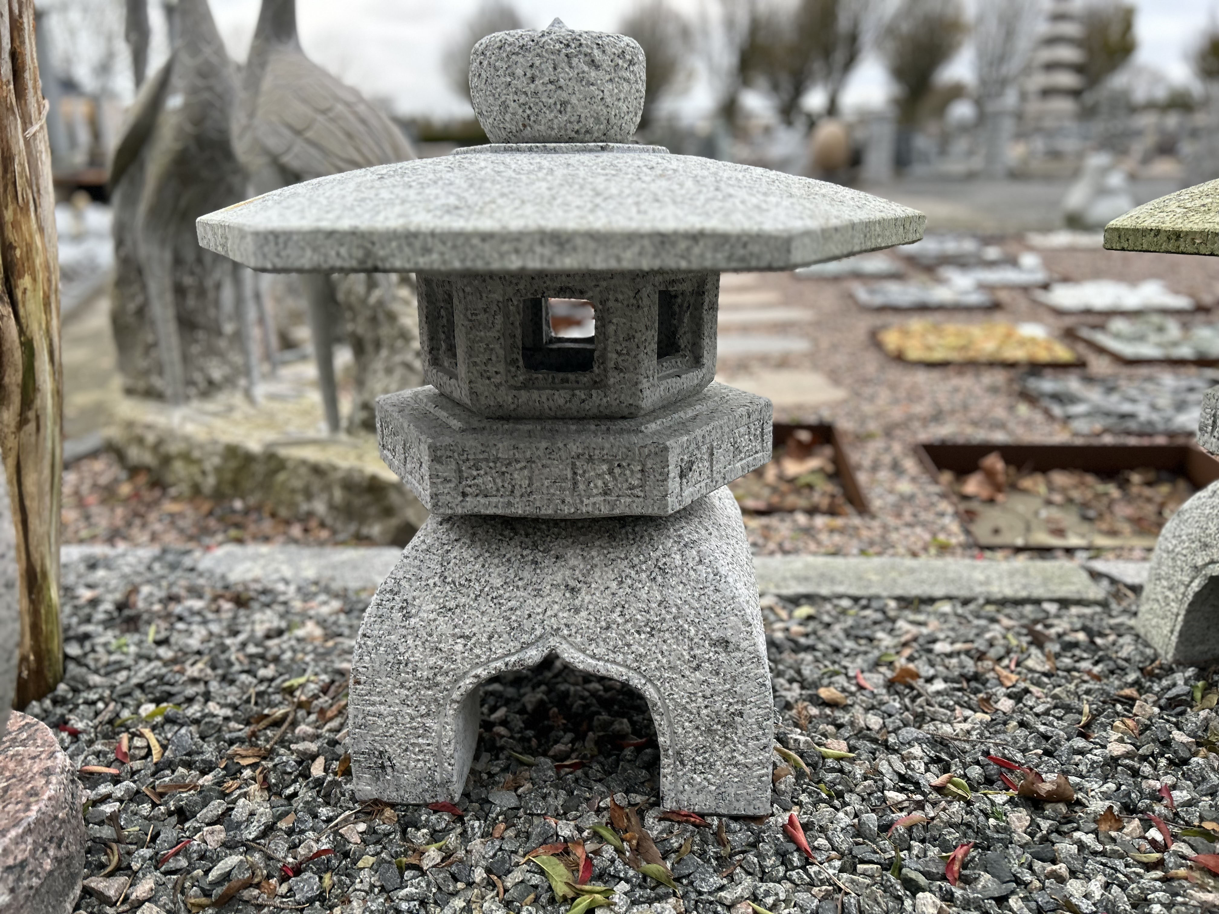 Granitlampe i japansk stil i grålig granit. Lampen kommer i flere dele, så den er nem at sætte op på stedet.
