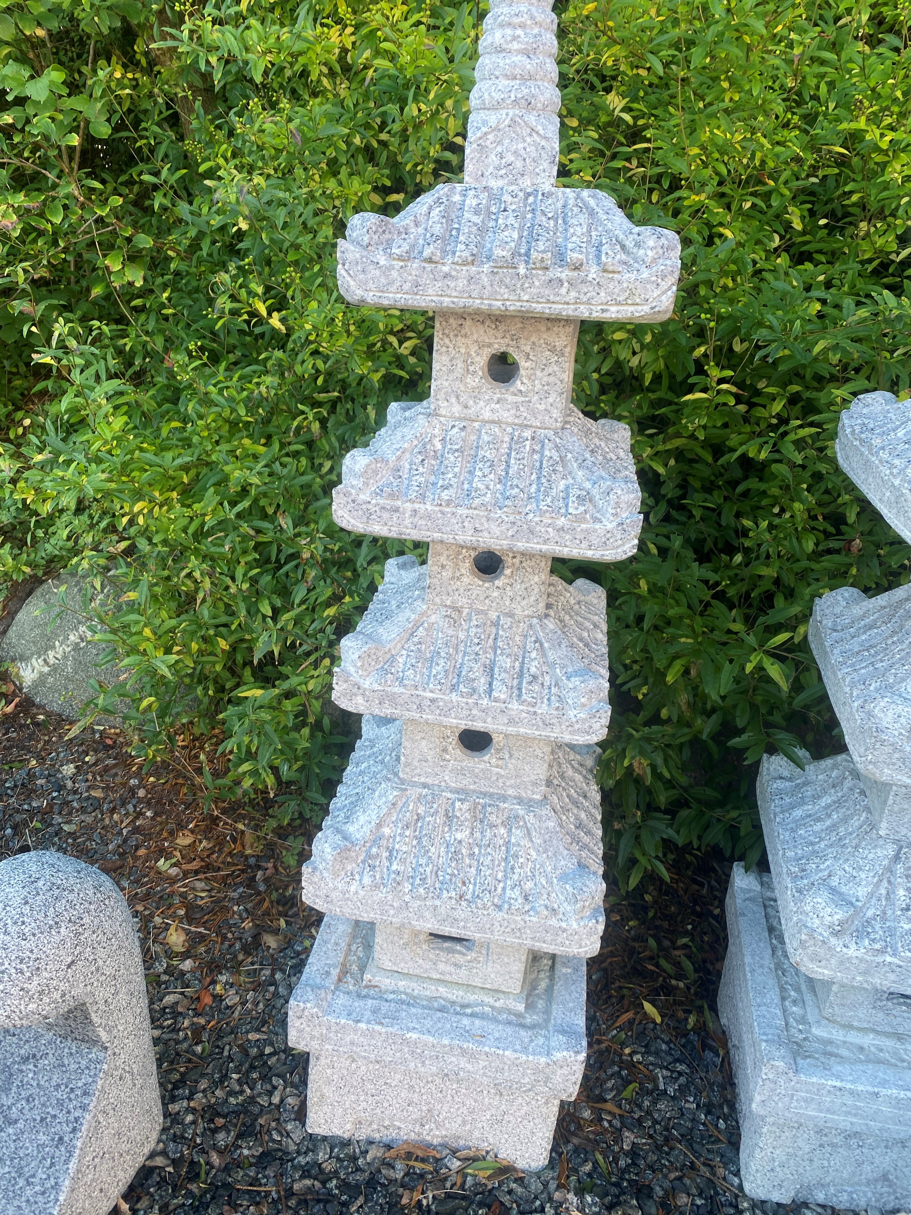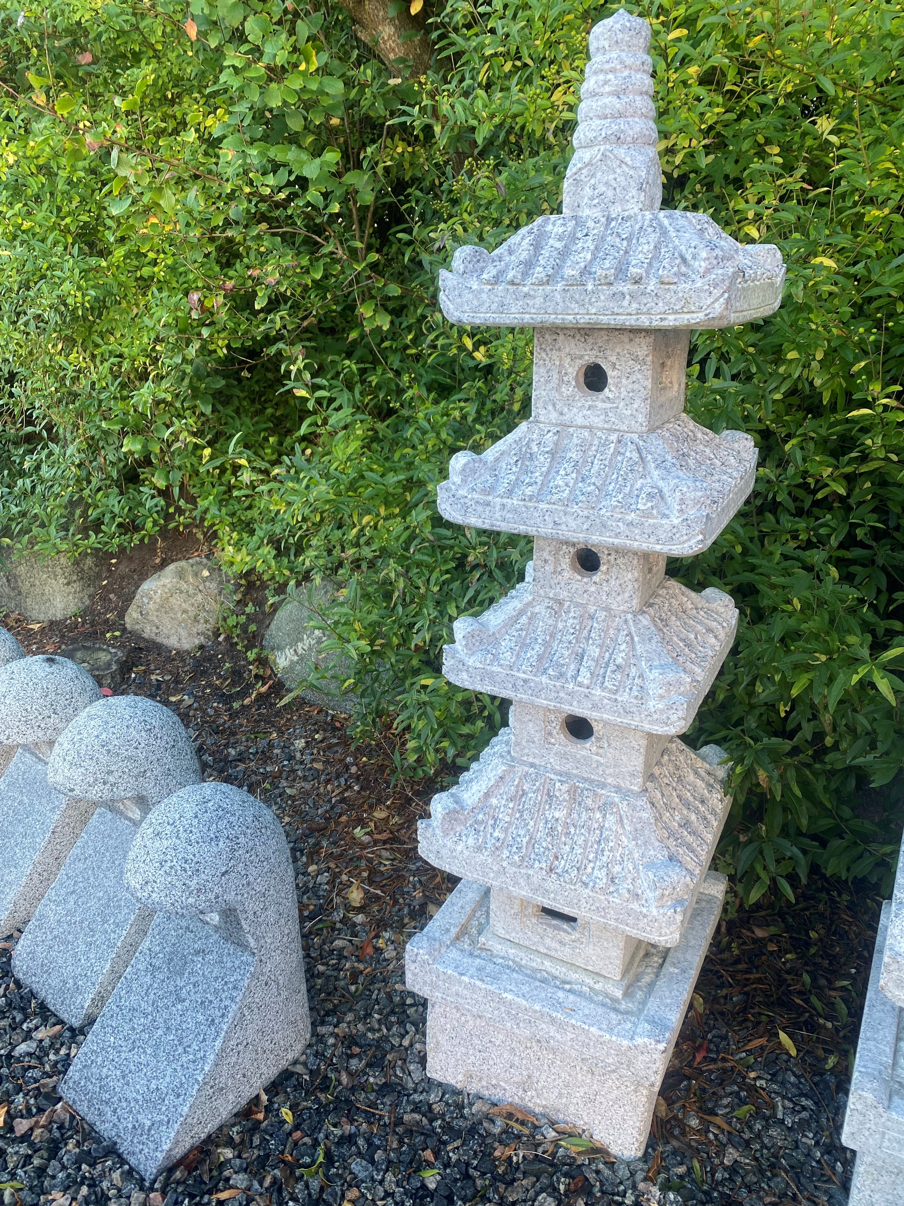 Granitpagode i japansk stil produceret i lys grå granit. Der kan installeres lys i pagoden til de mørke timer.