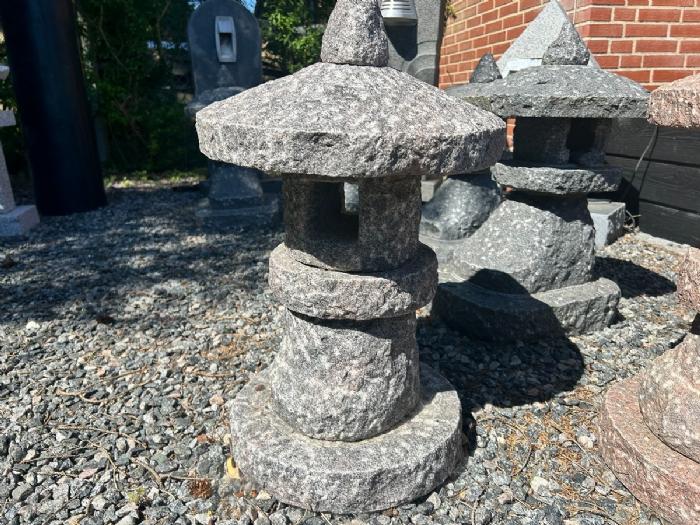 Japansk-inspireret havelampe i rødlig eller grå/lilla granit, der kan give din have et orientalsk udtryk.