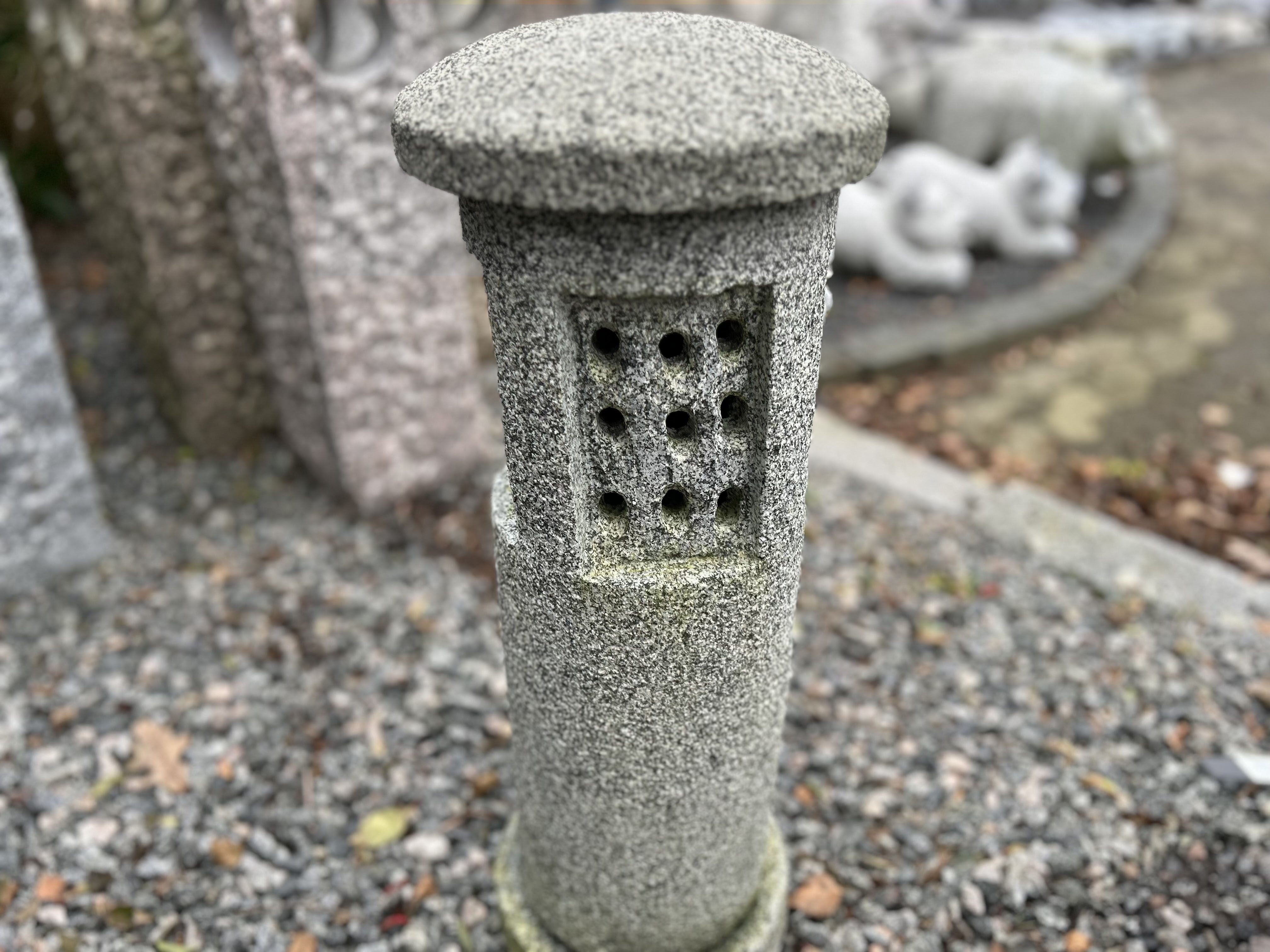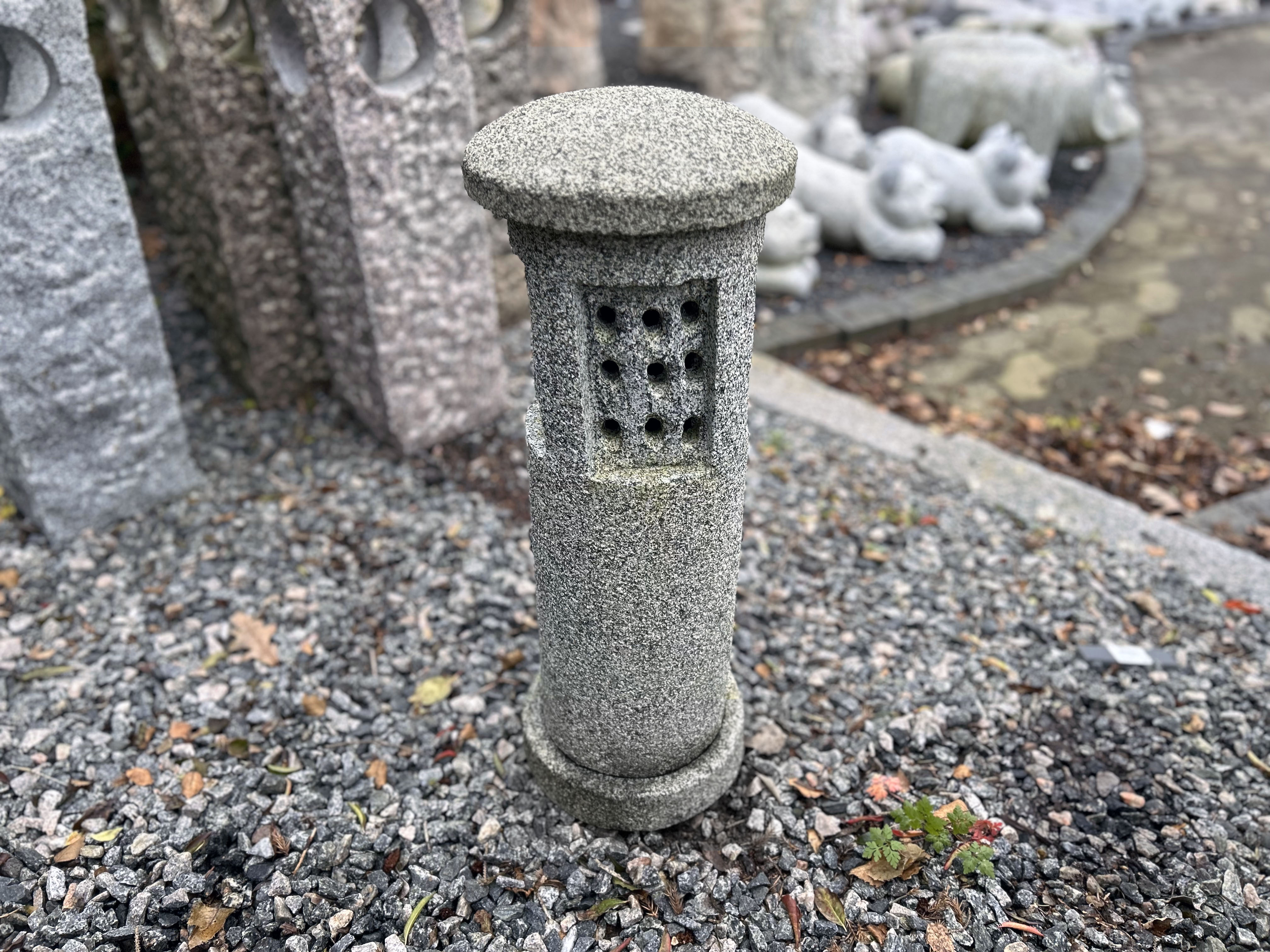 Lampe i grålig/gråsort granit med gittervindue hvor lyset kan kunne ud. Lampen kommer i 3 delen, hvilket vil sige at rør, top og bund er delt, så den er nemmere at håndtere.