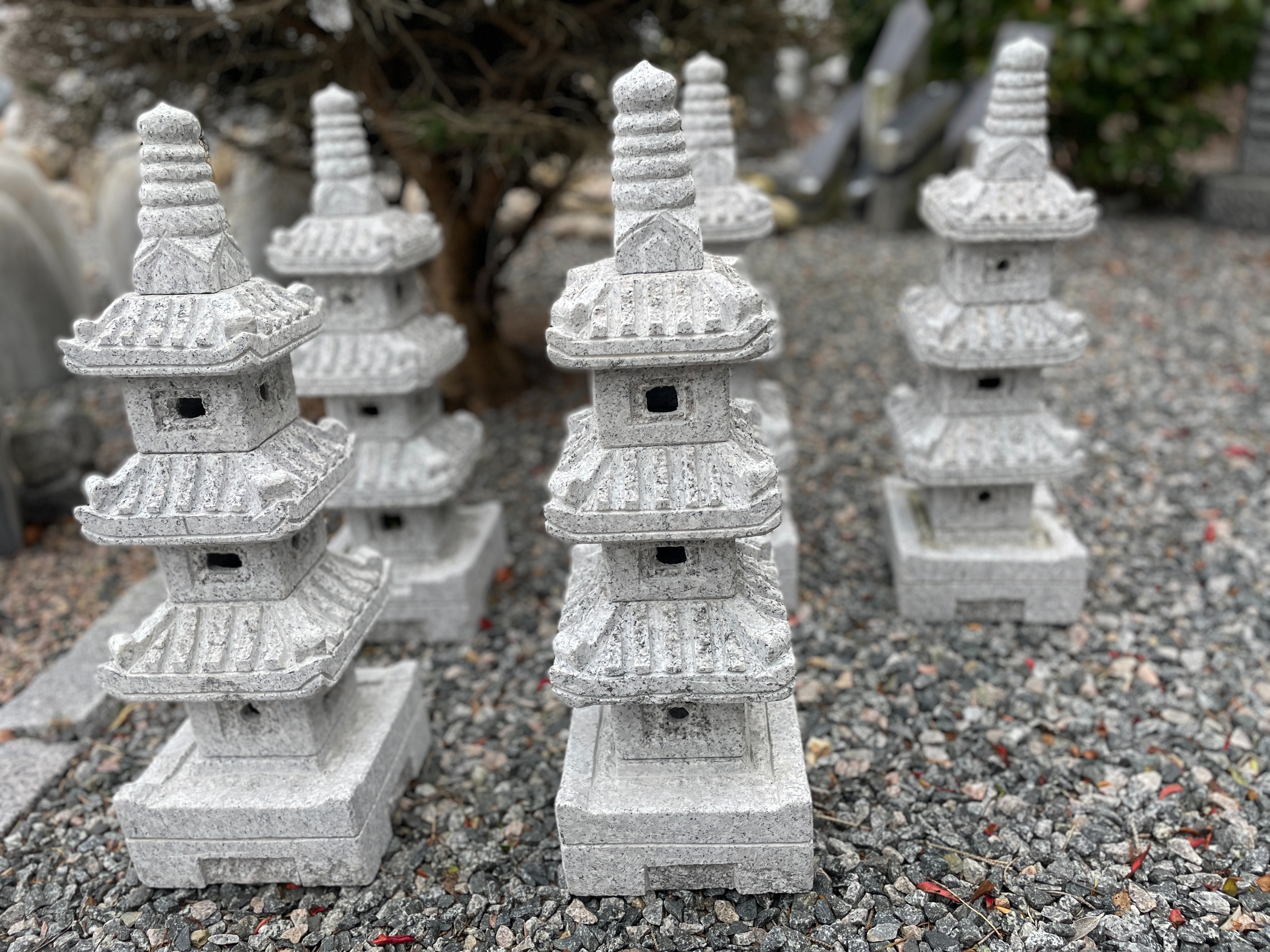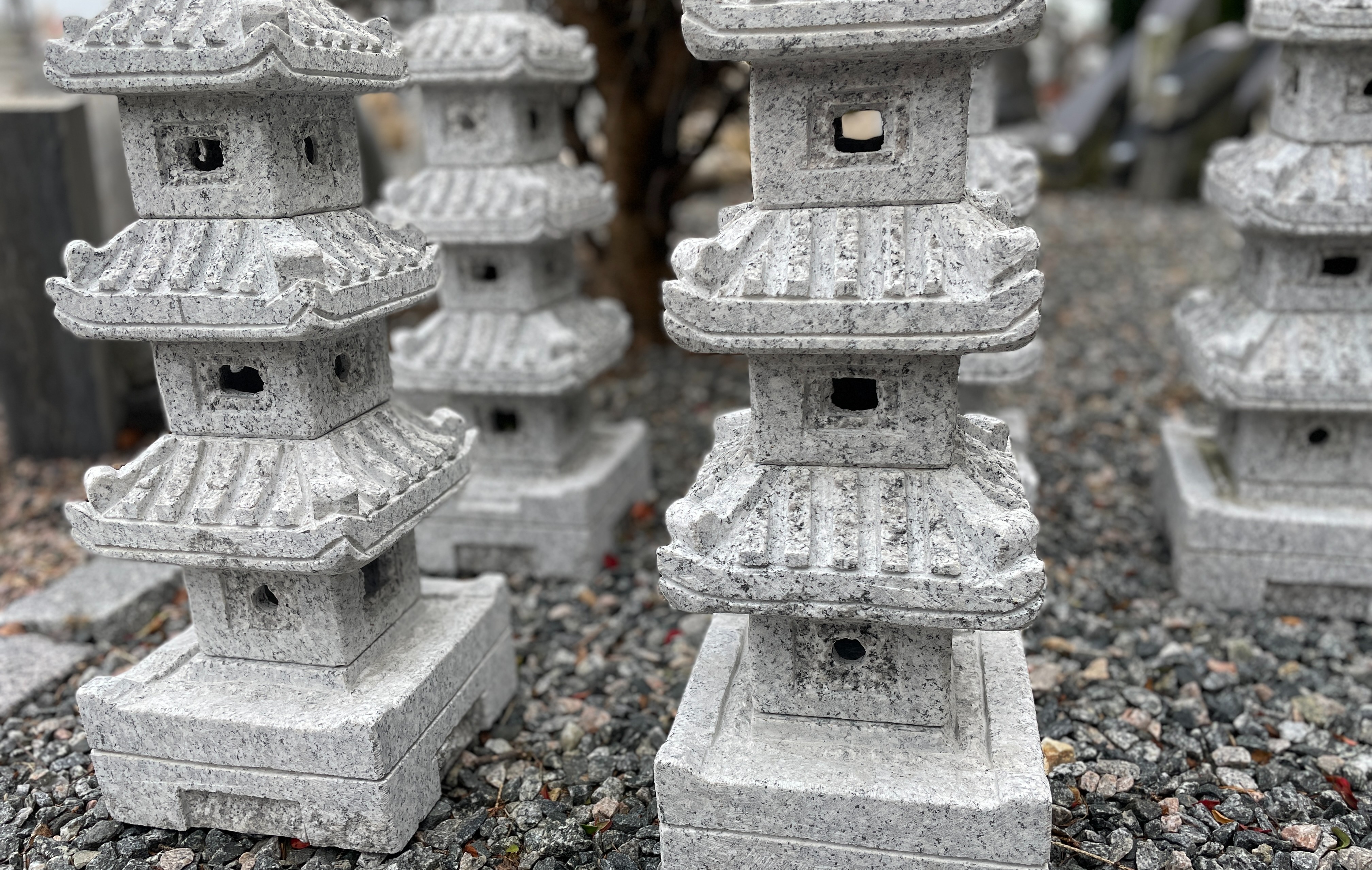 Japansk inspireret pagode i grå granit. Dette dekorative element kan både bruges til at pryde haven men også oplyse haven, da der er plads til lys nede i pagoden. Der er mulighed for at indsætte et halogenlys i det lille hul inde i pagoden.