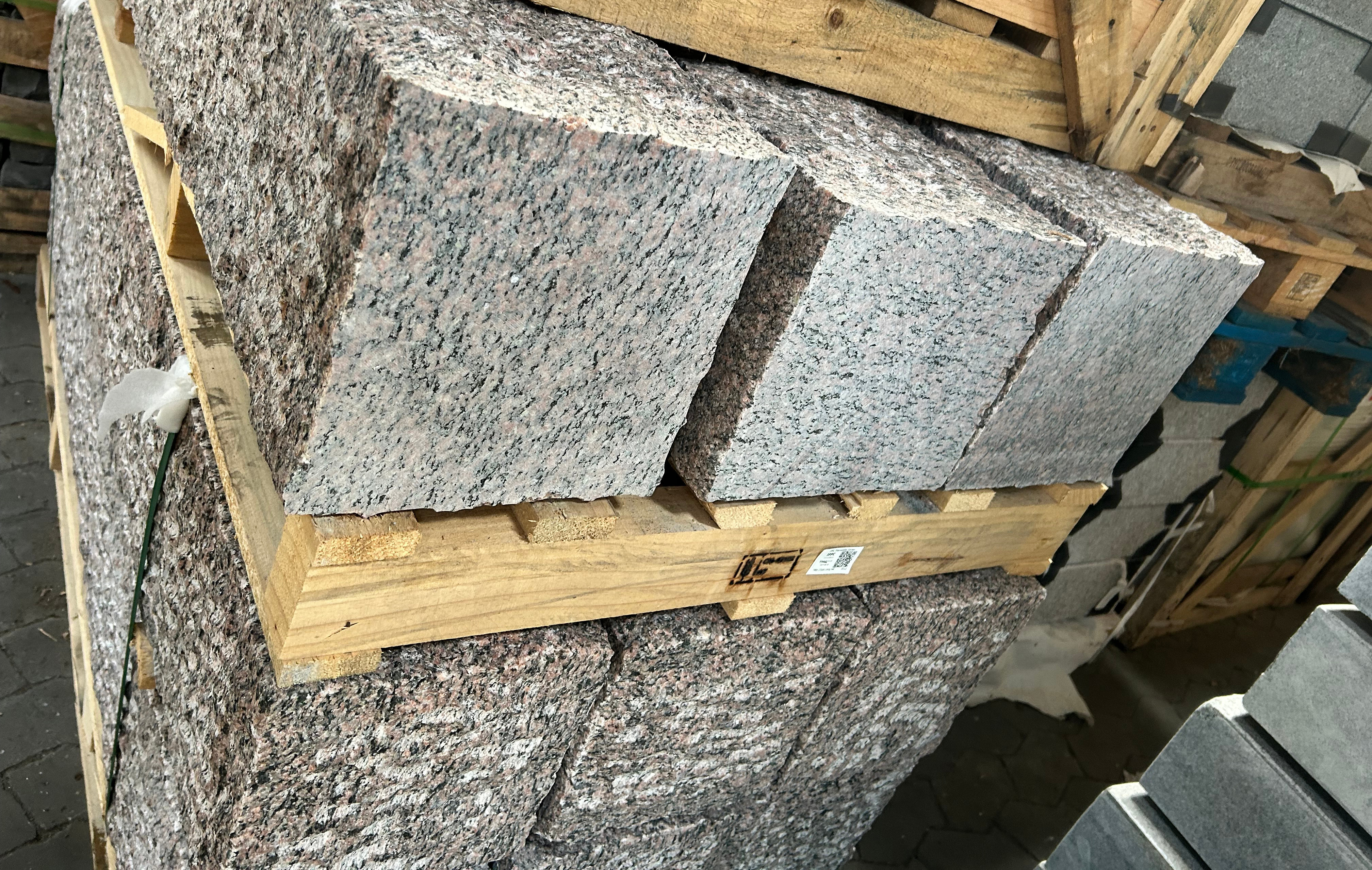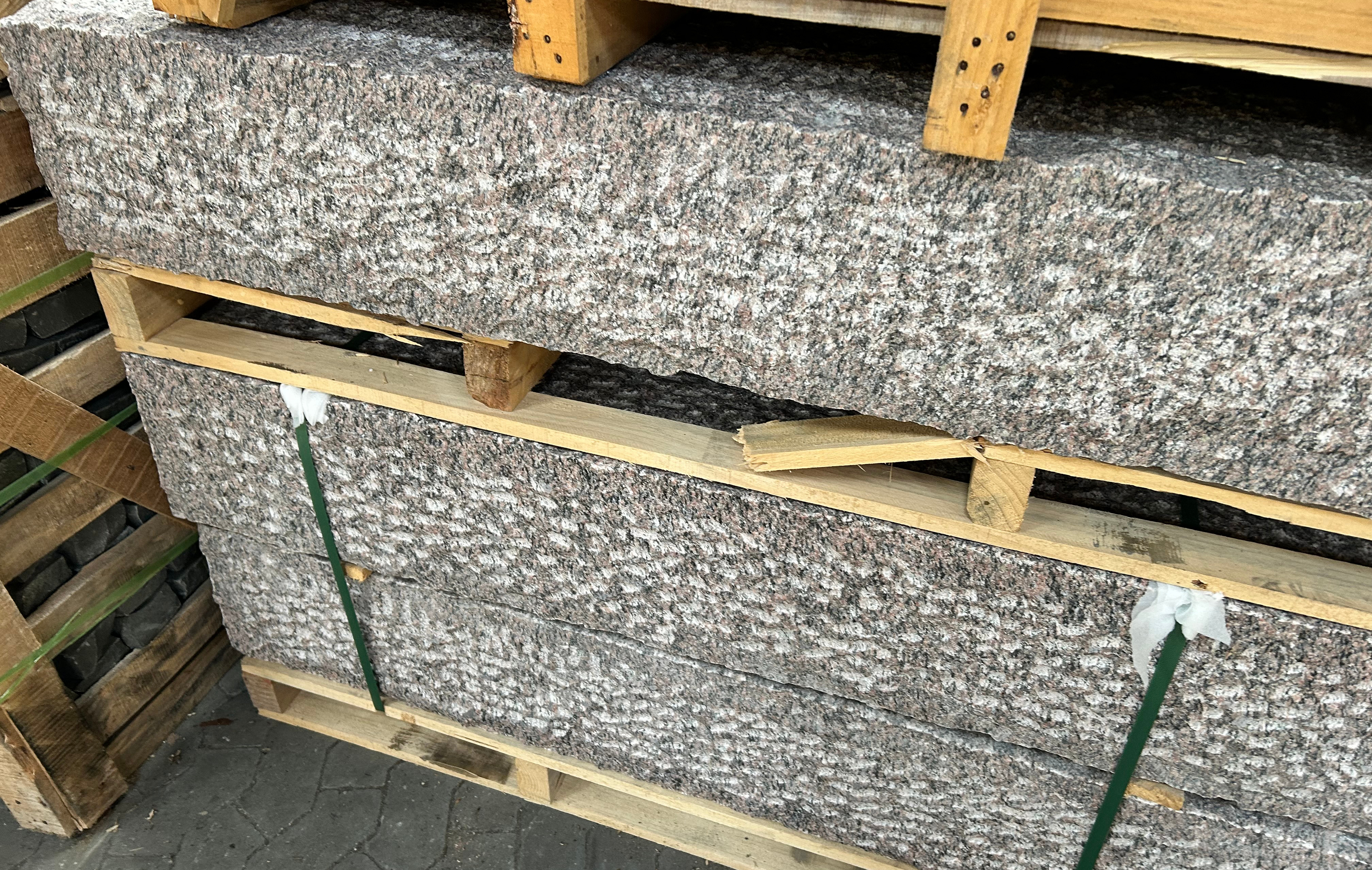 Pullert i rød granit med kløvet overflade. Soklen er kløvet på 4 sider og top; bunden er savet / glat.
