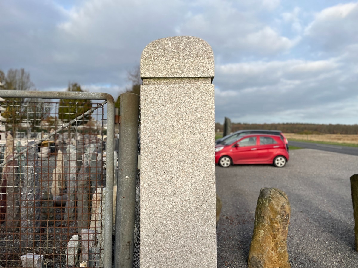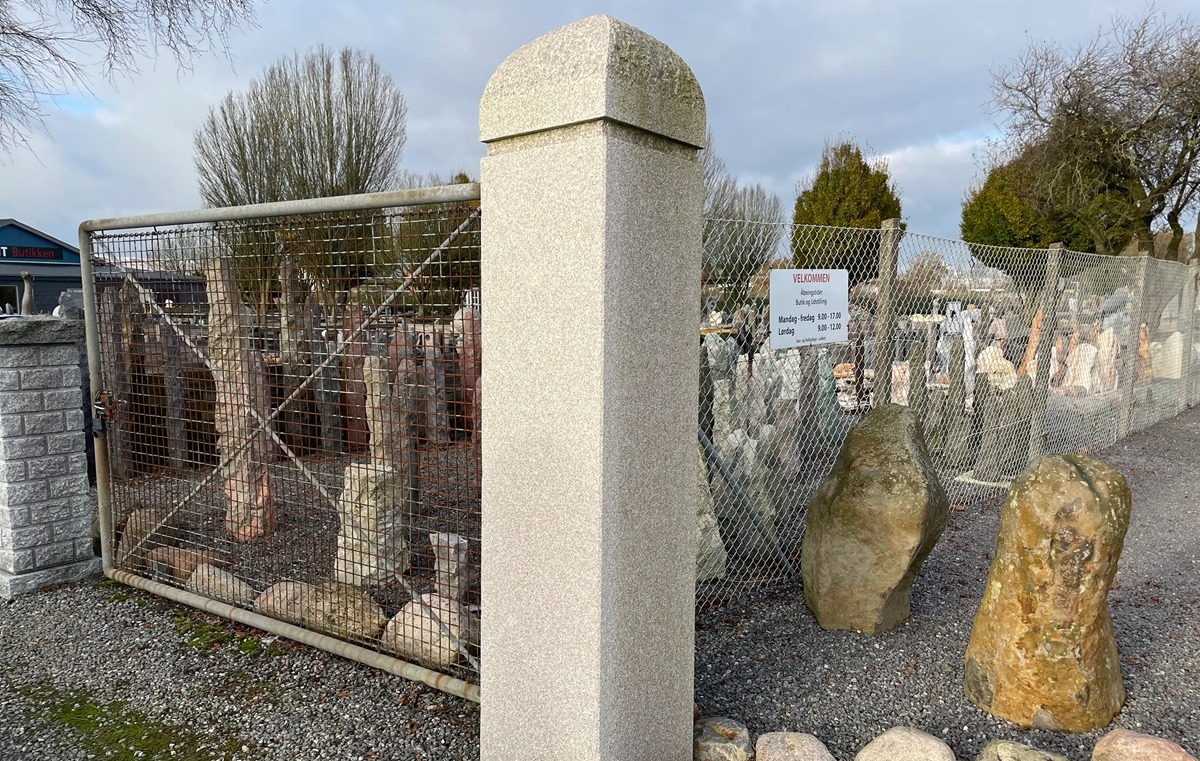 Søjlen har en stokhugget og ru overflade, samt afrundede detaljer på toppen. Det er et element som er velegenet til indkørsler som vist på billedet, og man kan enetuelt tilføje husnummer.