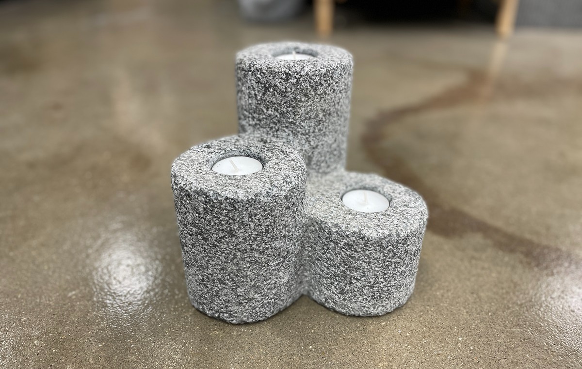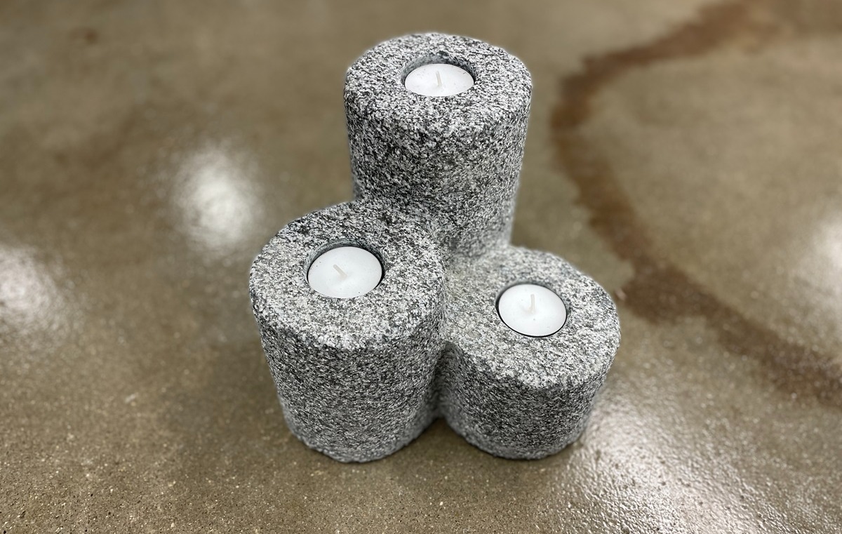 Fyrfad lavet i gråsort granit. Fyrfadet har tre forbundene niveauer som skaber en flot variation. Det er et dekorationselement der er velegnet til spisebordet eller som lys ved hus og have.