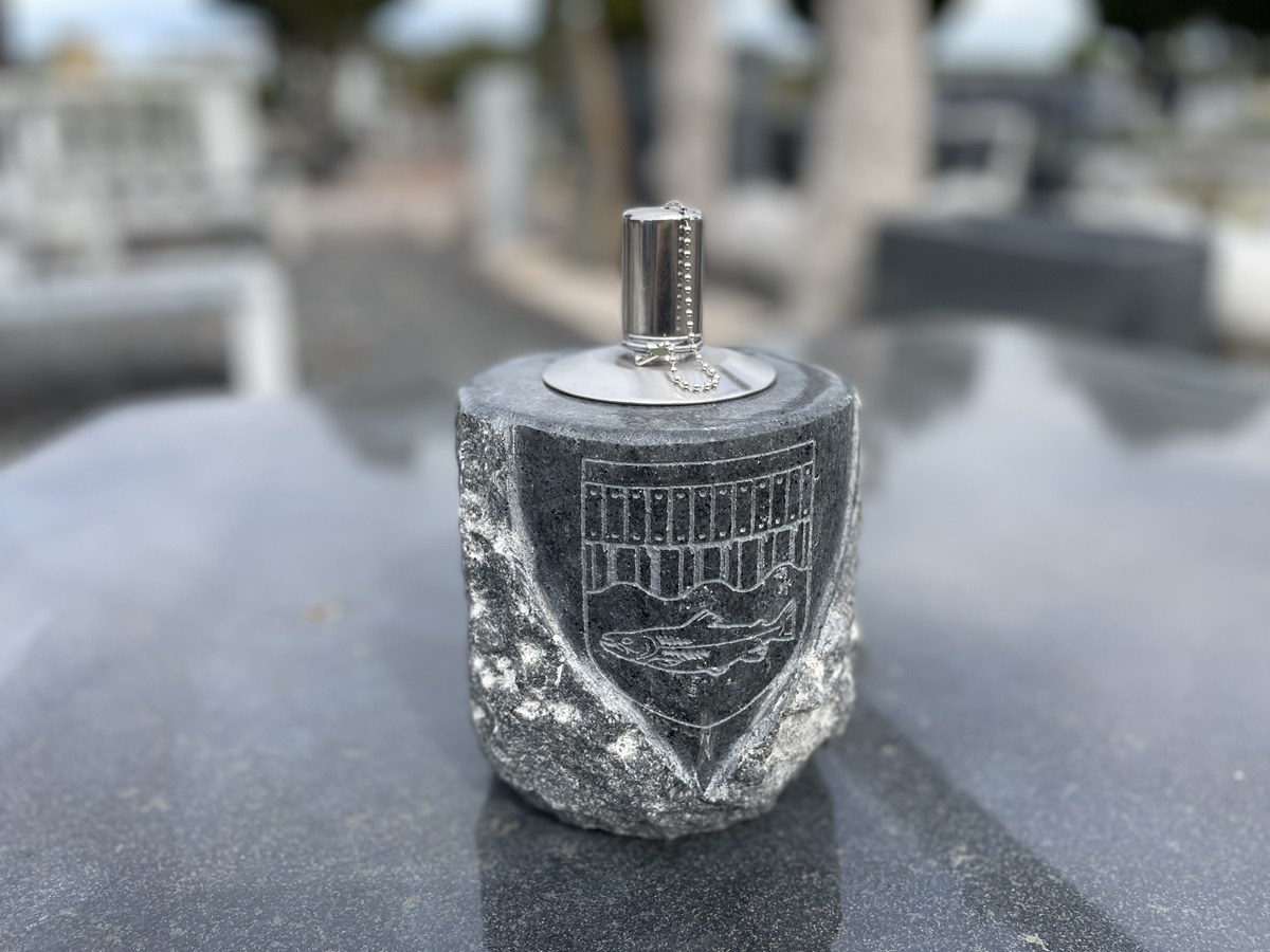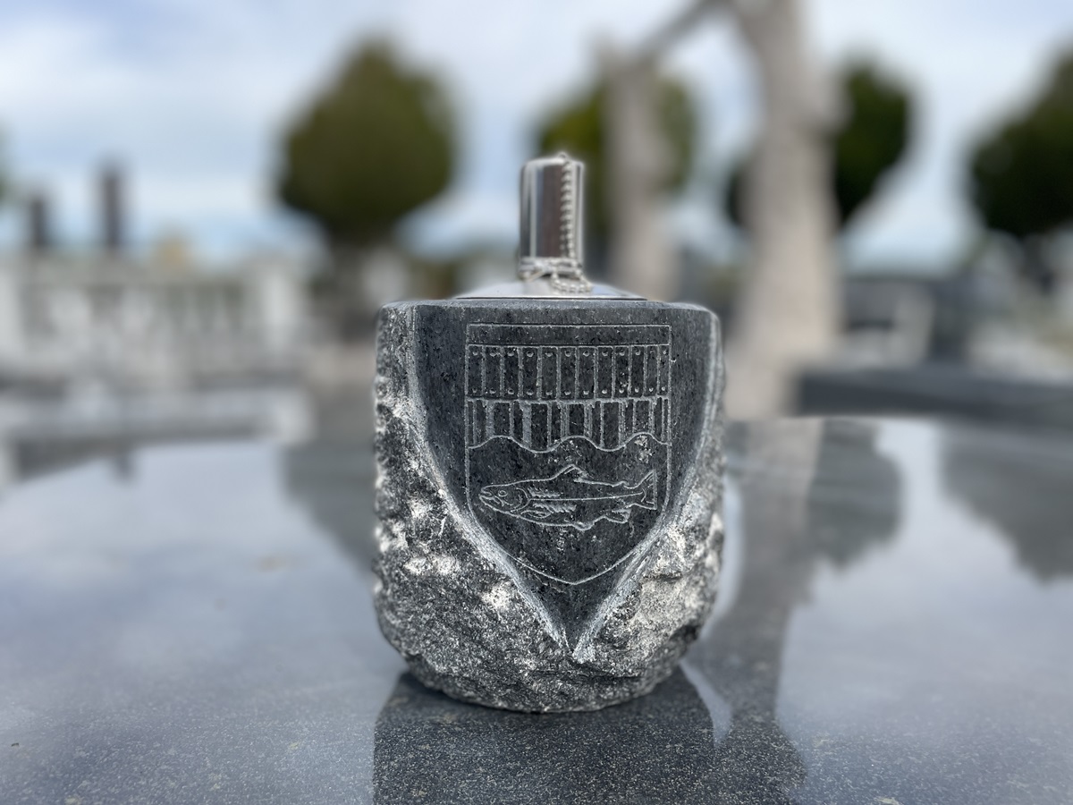 Ildsten lavet i poleret gråsort granit, med Skives byvåben graveret på siden.