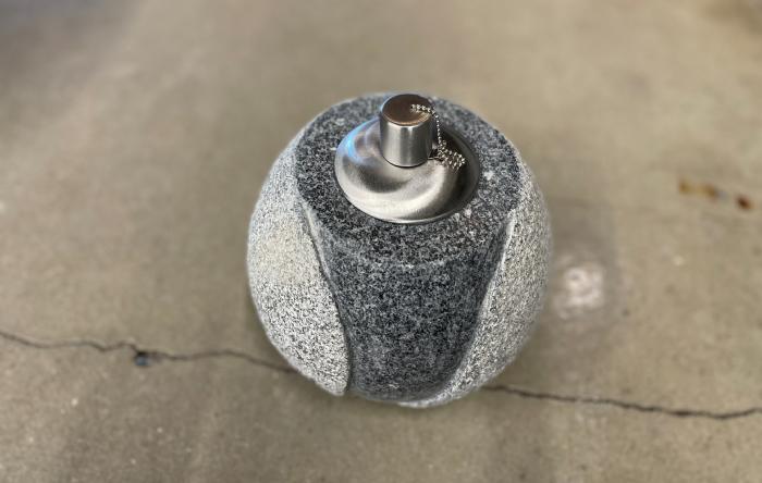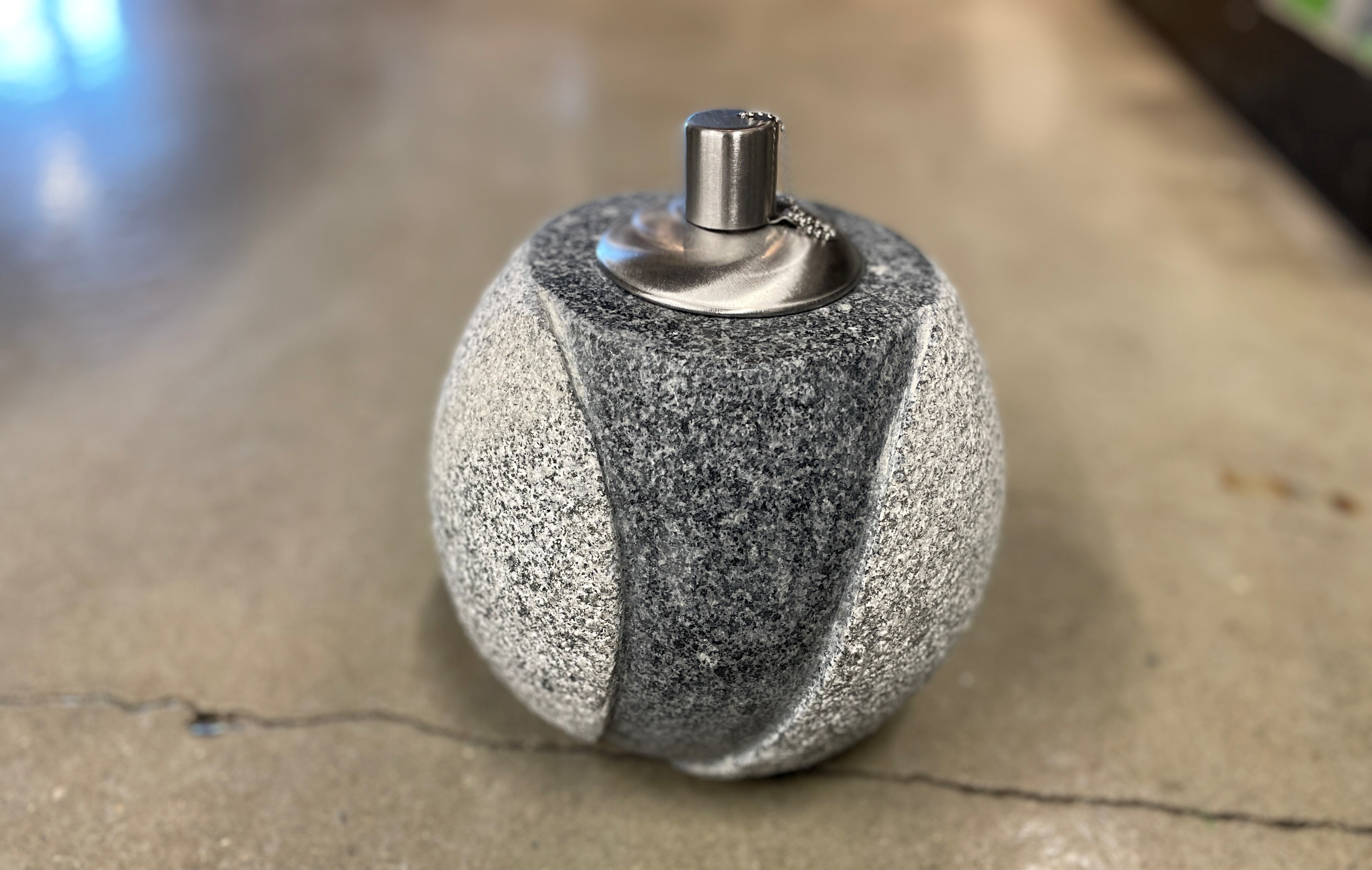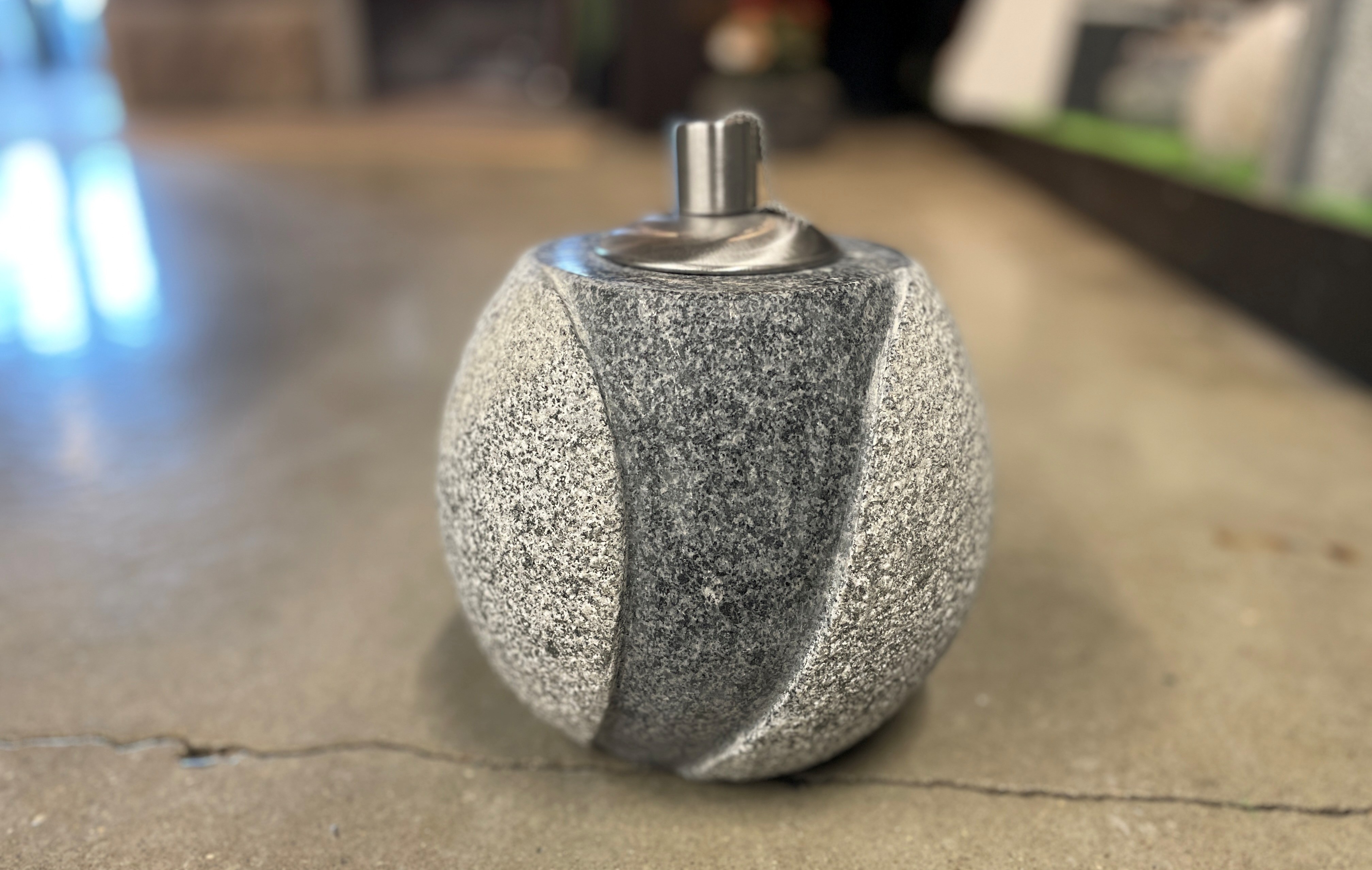 Få lys og ild i haven med en olielampe produceret i gråsort granit. Olielampen er rund og har en fin poleret top og let ruflet mønster på resten af stenen.