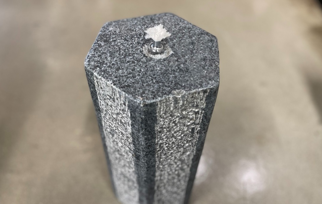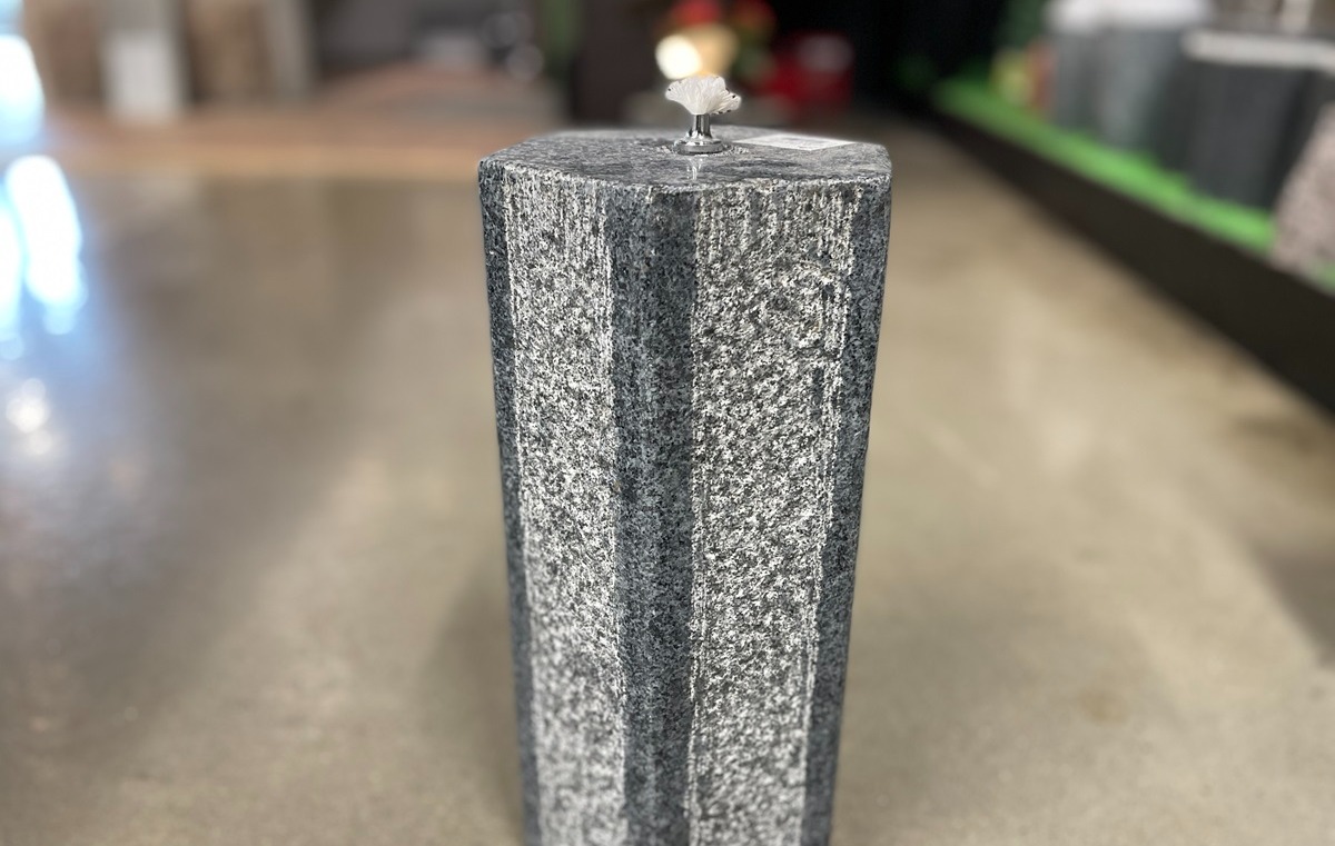 Olielampe lavet i gråsort granit med polerede detaljer på hjørner og toppen – en enkel og stilfuld olielampe, der passer ind på de fleste terrasser og ved havebedene.