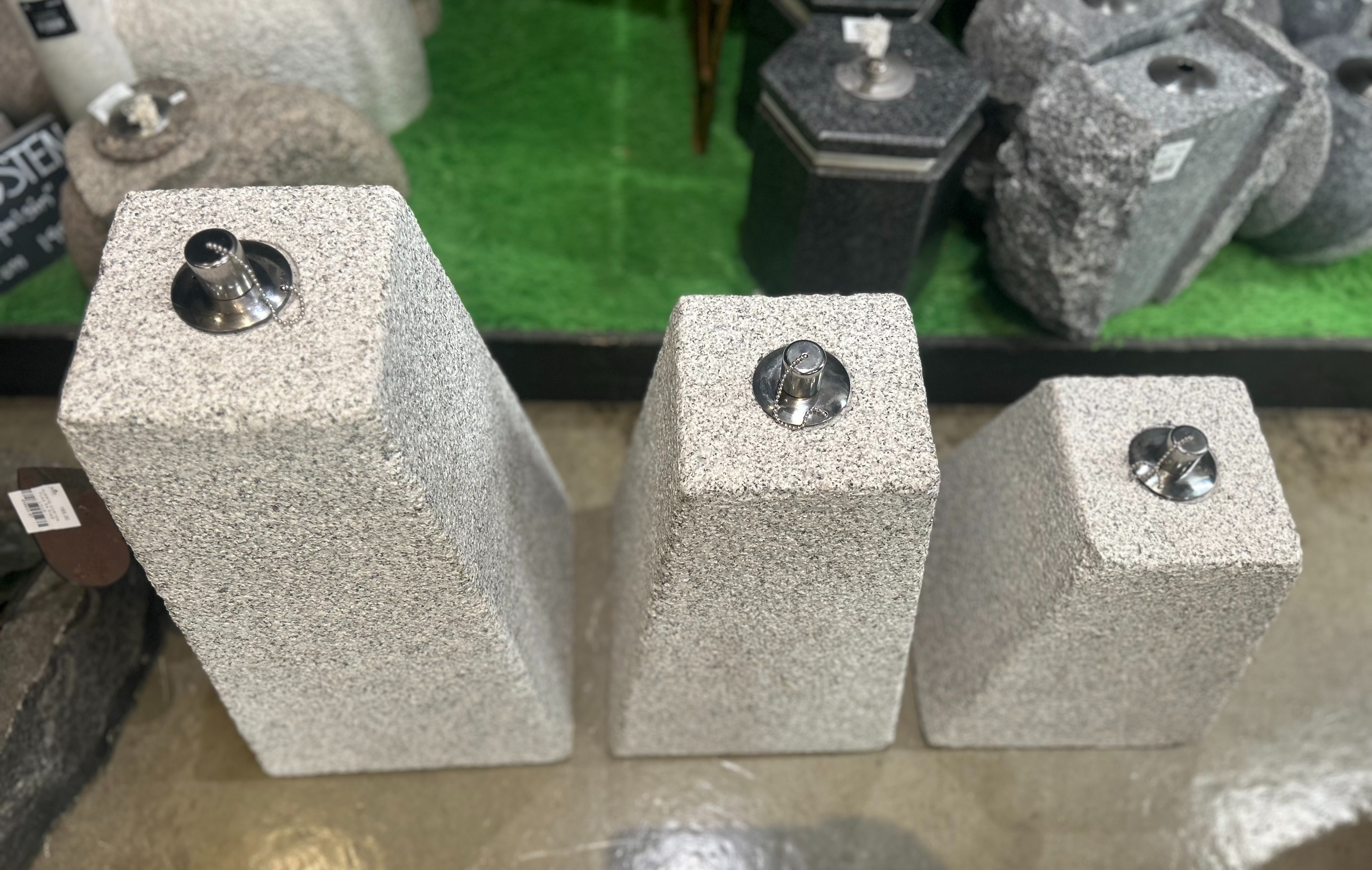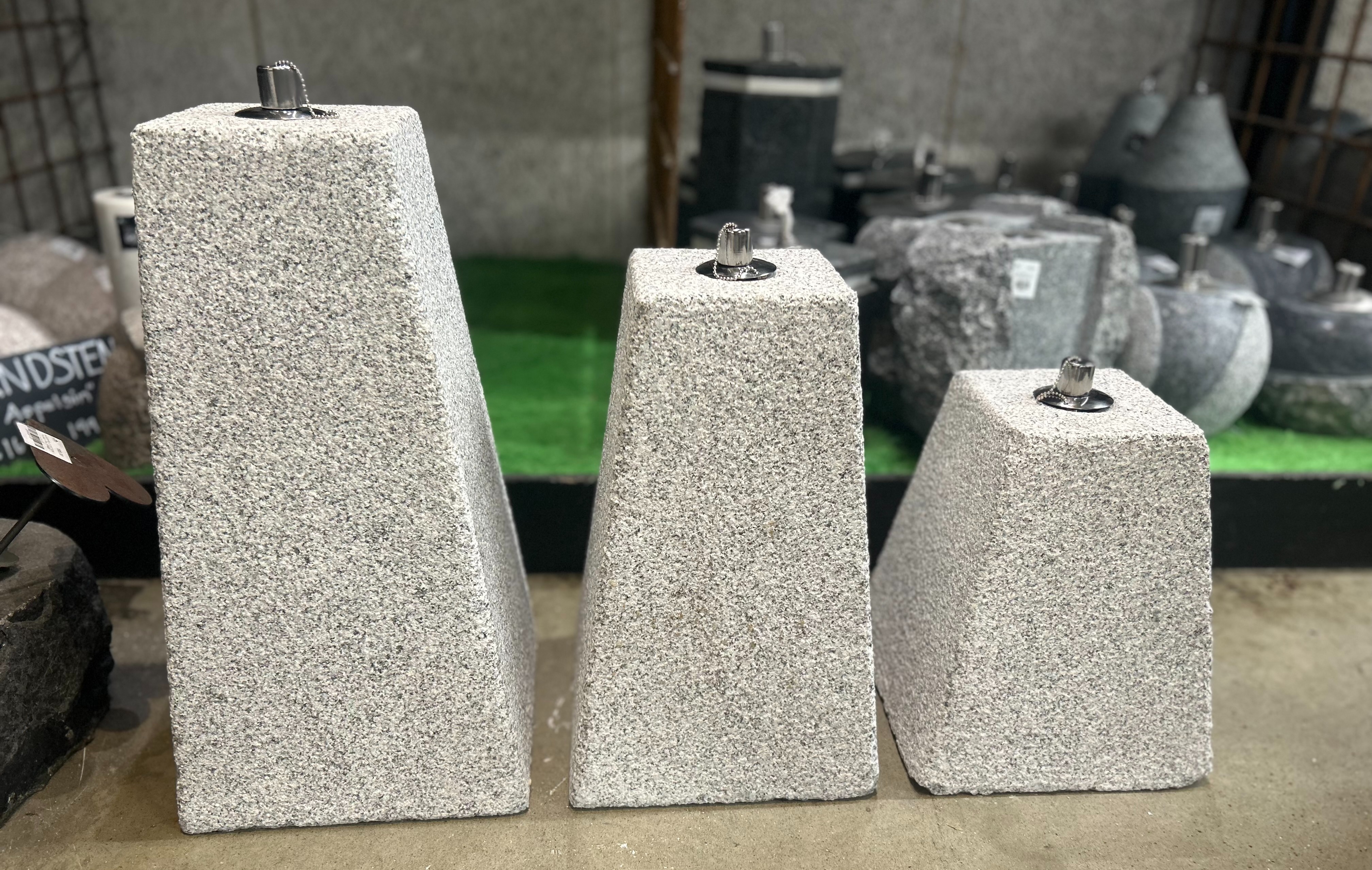 Olielamper udhugget i lysegrå granit med en ru/stokhugget overflade.