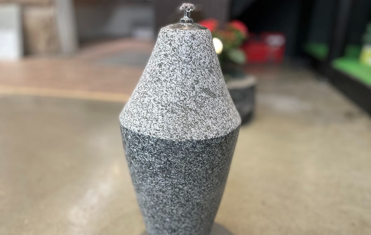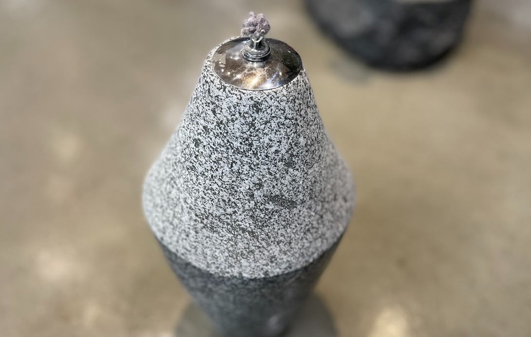 Olielampe lavet i grå granit, hvor den nederste halvdel er poleret. Den polerede del skaber en fin kontrast til den rå overflade og fremhæver granittens farvespil – en enkel og stilfuld olielampe, der passer ind på de fleste terrasser og ved havebedet.