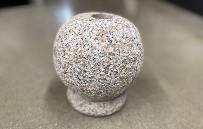Olielampe på fod, lavet i grå granit, med stokhugget overflade som giver et rustikt udtryk.